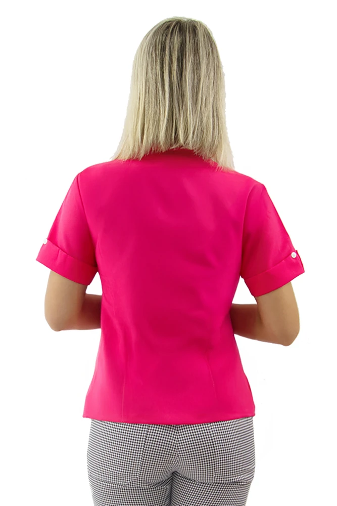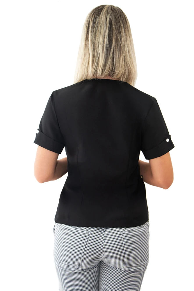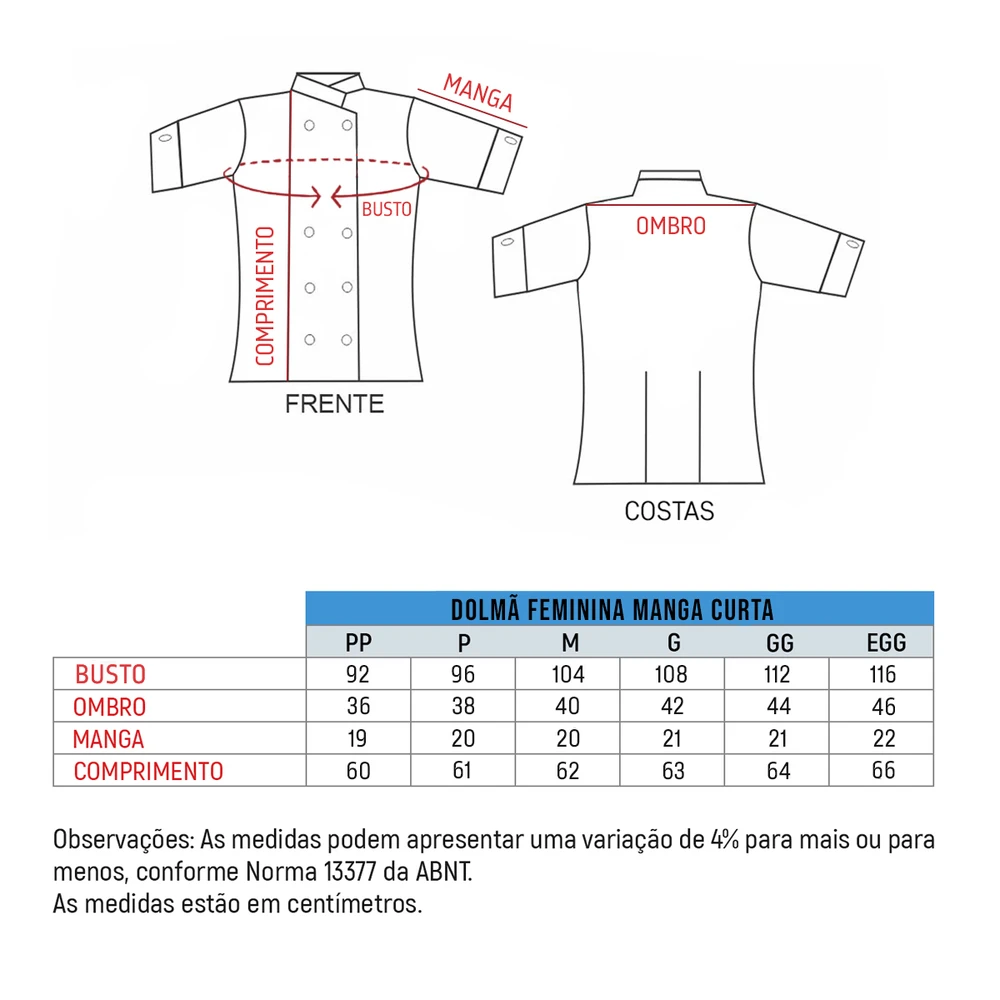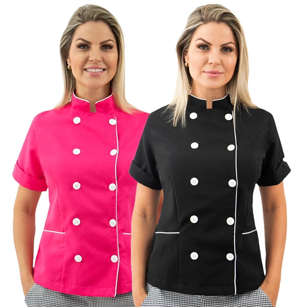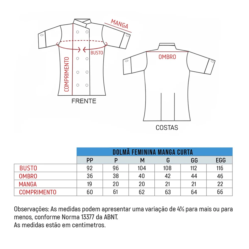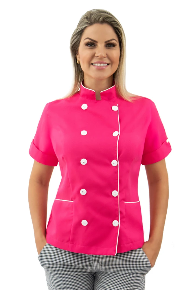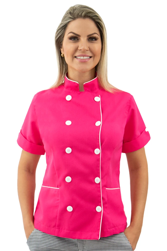 A Dólmã Chef de Cozinha feminina ACINTURADA manga curta, também chamada de jaqueta cozinheira é produzida em tecido Oxford Premium.