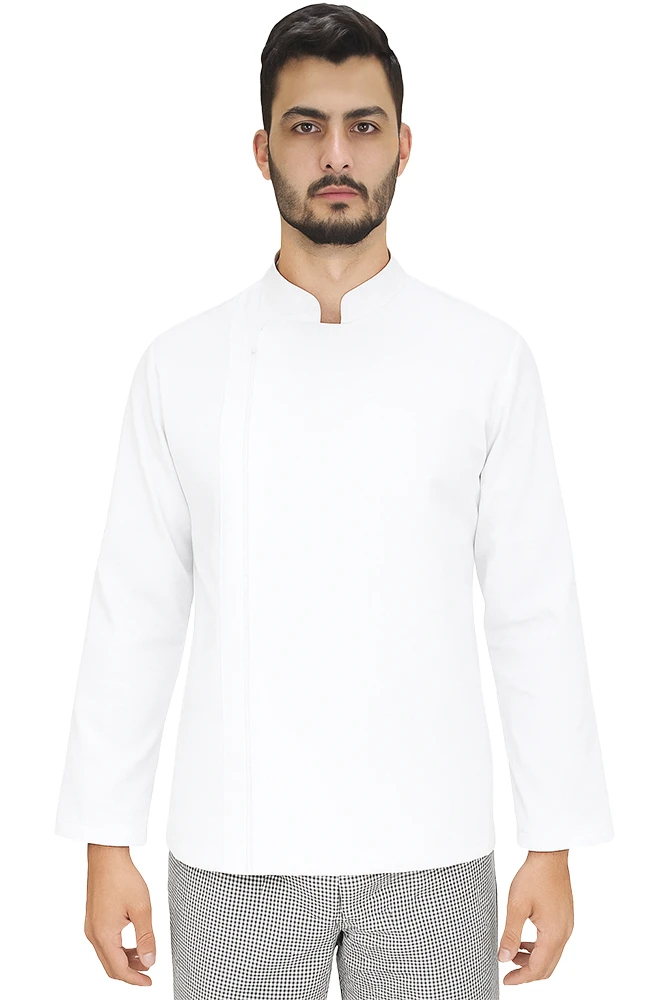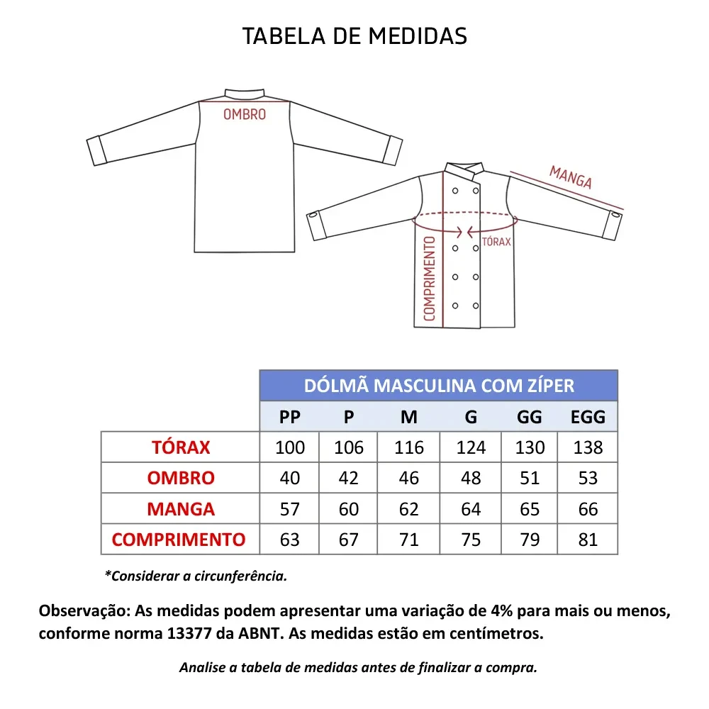 O Dólmã Chef de Cozinha masculina com Zíper é produzido com tecido Clássico, Brim Tapé da Santista, tecido 100% Algodão.