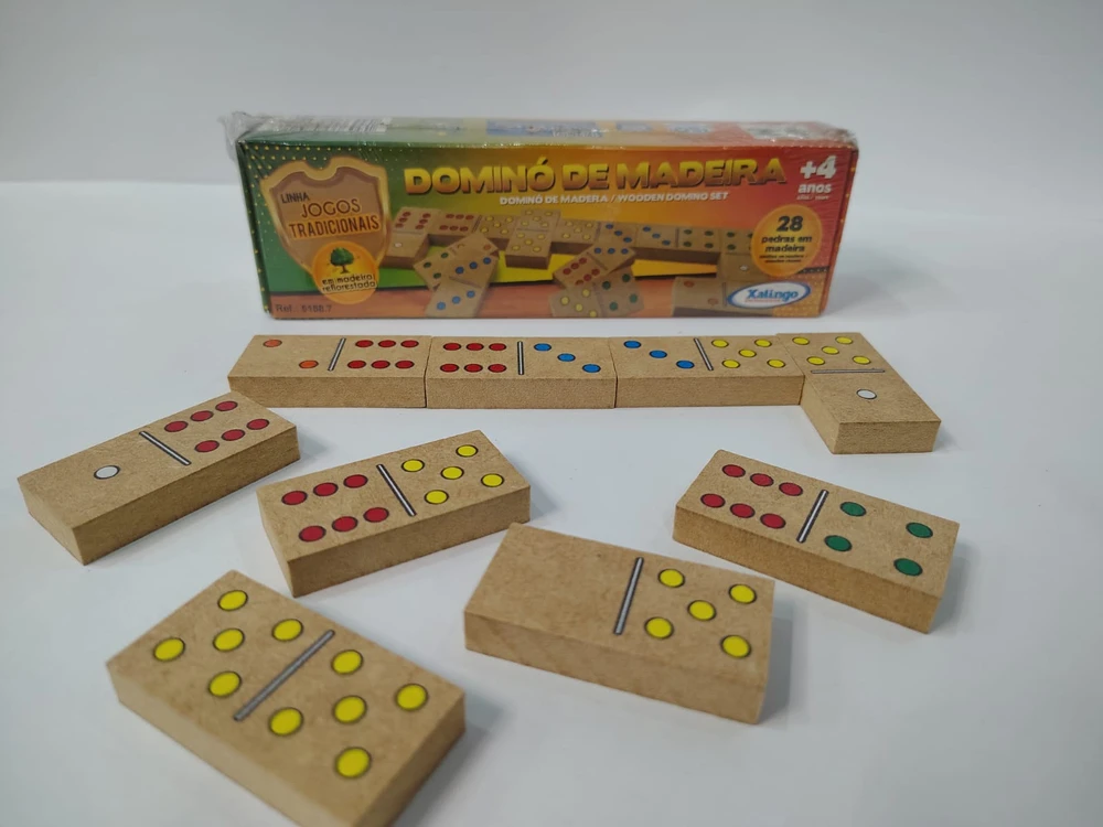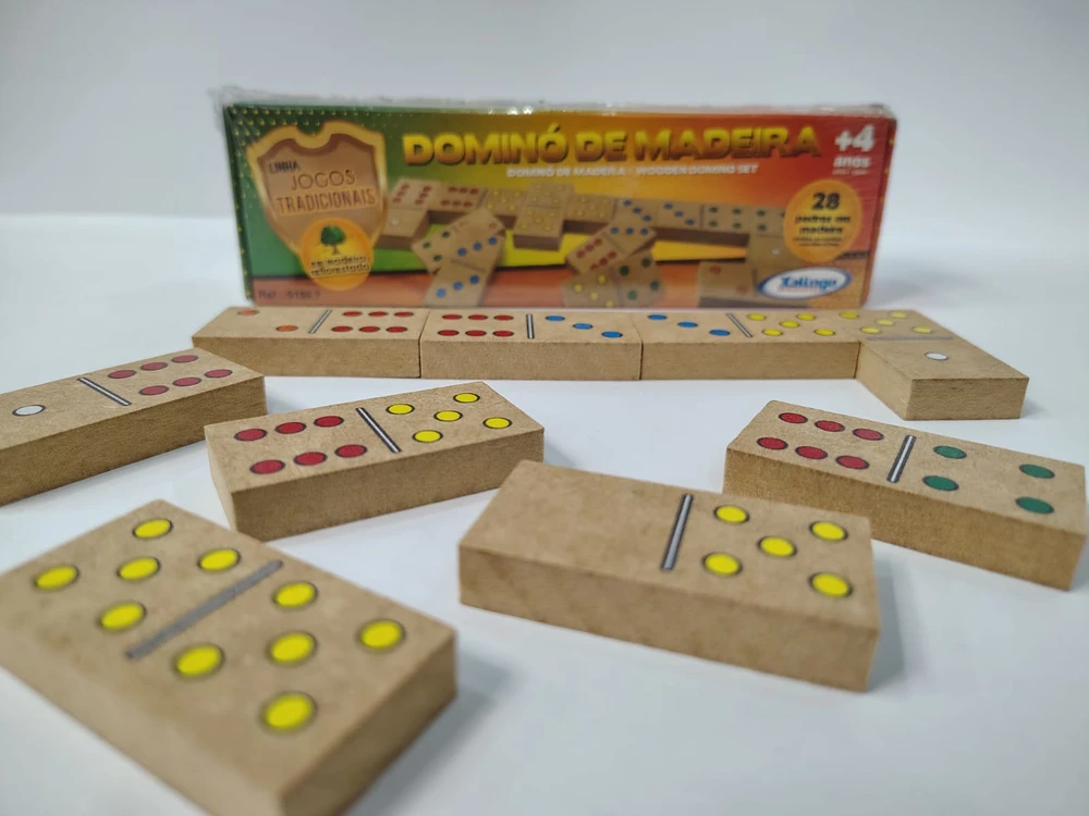 Produzido em madeira reflorestada, o dominó oferece durabilidade e toque agradável, com peças coloridas que facilitam a identificação dos números, tornando o jogo mais dinâmico e acessível para crianças e adultos.
