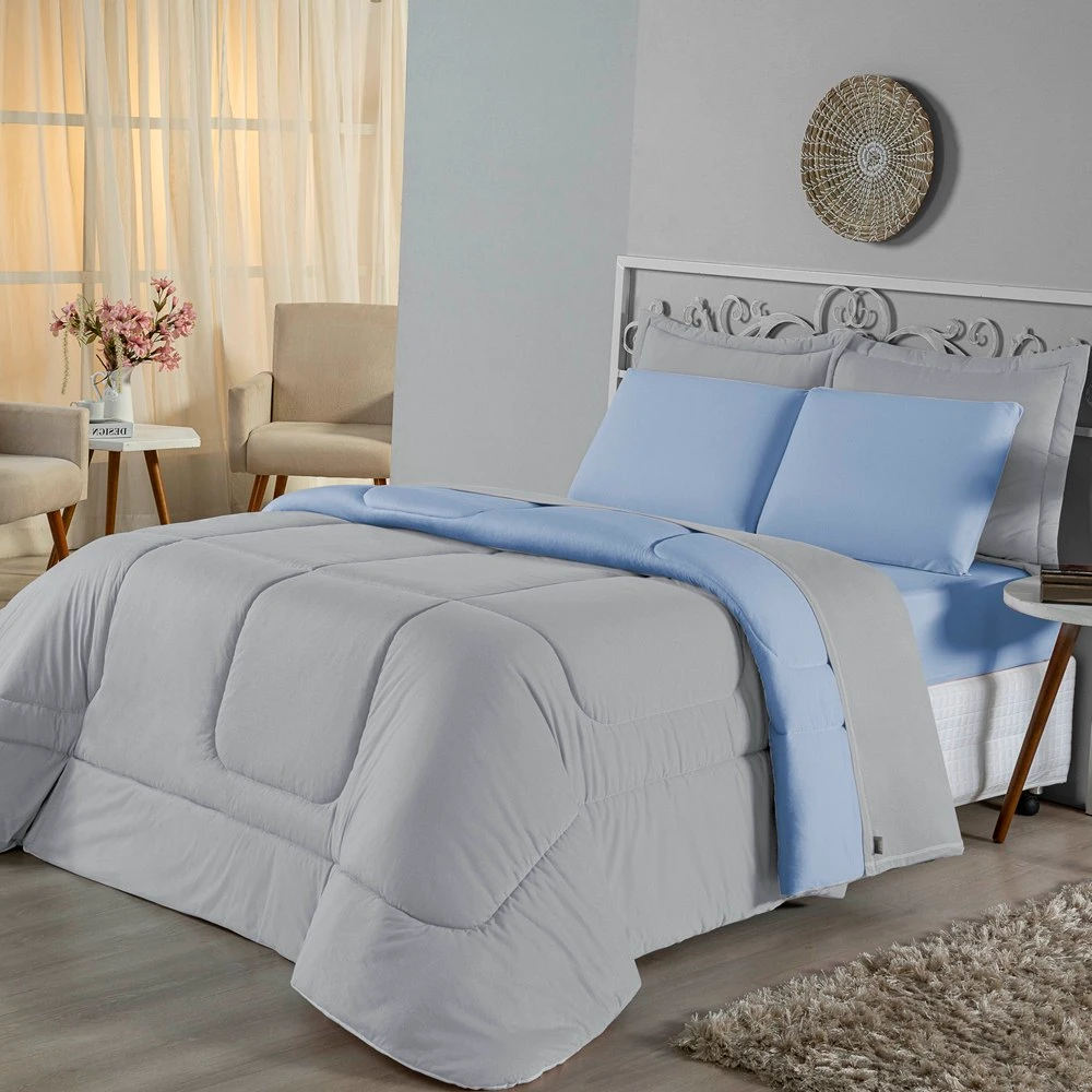 Edredom Casal Dupla Face Malha 100% Algodão 1 peça - Azul Bebe / Cinza