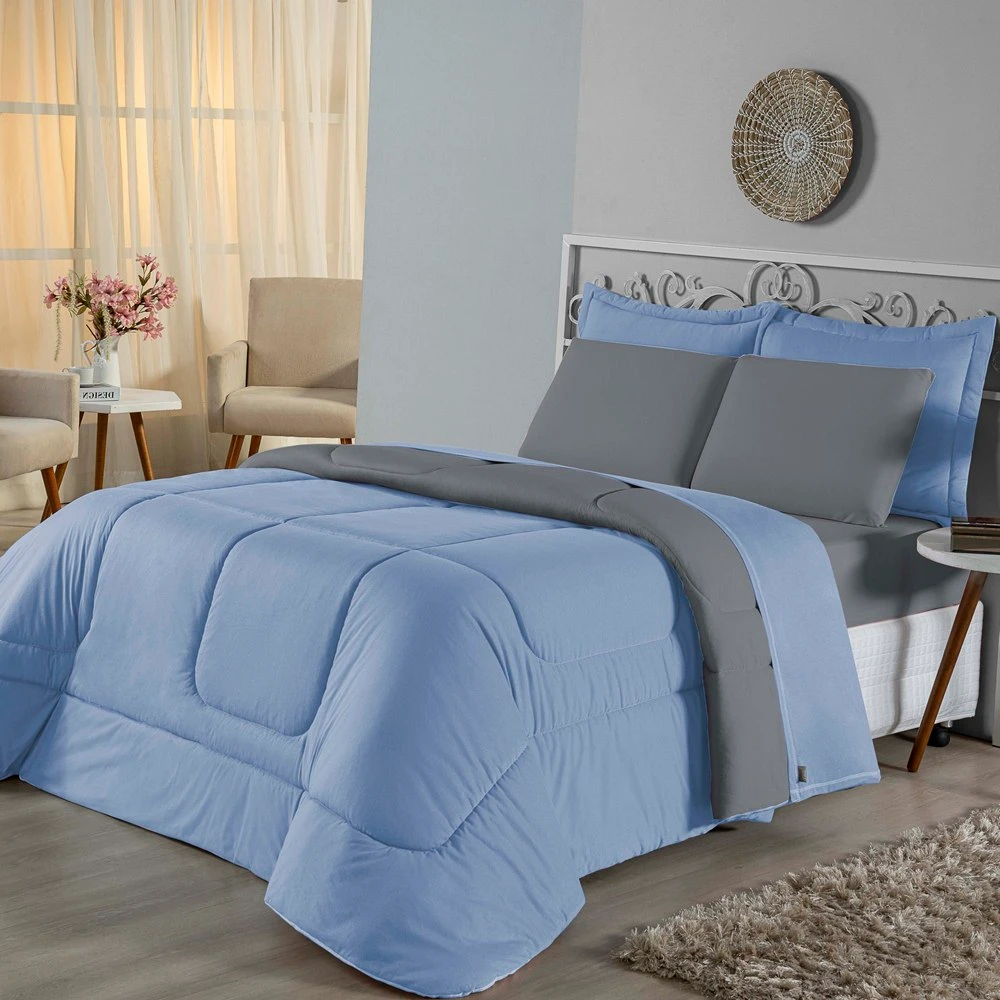 Edredom Queen Dupla Face Malha 100% Algodão 1 peça - Azul Bebe / Cinza
