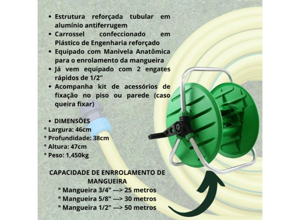 Sua armação em alumínio reforçado e seu sistema de acondicionamento lhe proporcionam maior durabilidade para sua mangueira, uma vez que enrolada evitamos as possíveis dobras e compactamos seu tamanho na hora de guardá-la.