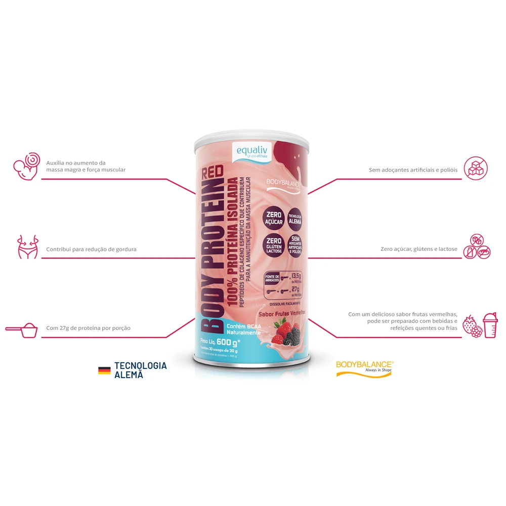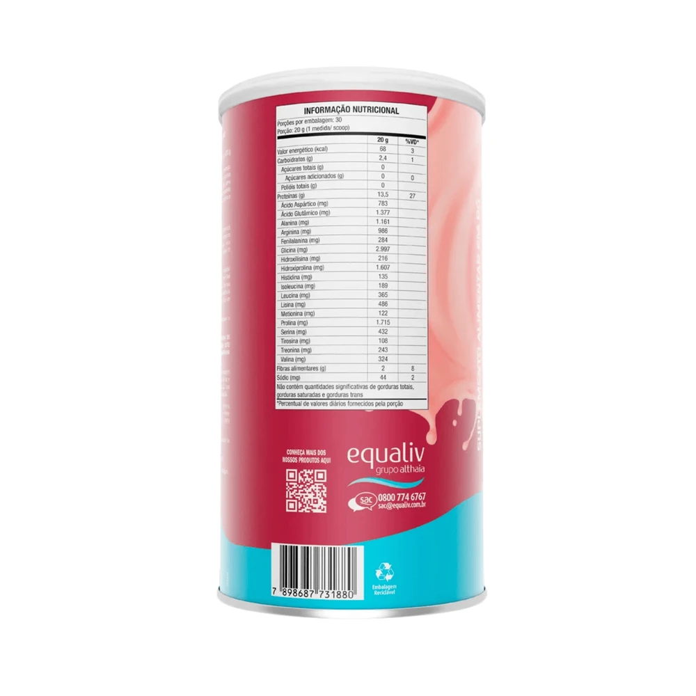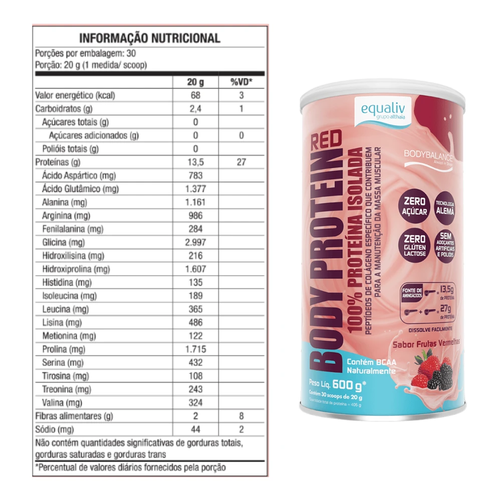 Equaliv Body Protein 450g Proteina Isolada Frutas VermelhasEqualiv Body Protein é um suplemento para quem pratica atividade física e deseja alcançar melhores resultados. Uma tecnologia inovadora da proteína isolada com peptídeos de colágeno dedicados ao fortalecimento da musculatura corporal. Eficácia comprovada com 15g/ dia + 3 horas de exercícios físicos por semana. Fácil digestão e diluí completamente. Sabor neutro. Zero de açúcar, carboidrato e lactose. Livre de glúten e edulcorante. Contribui para a manutenção da Massa Muscular.Produto isento da obrigatoriedade de registro conforme rdc n.27/10 - anvisa