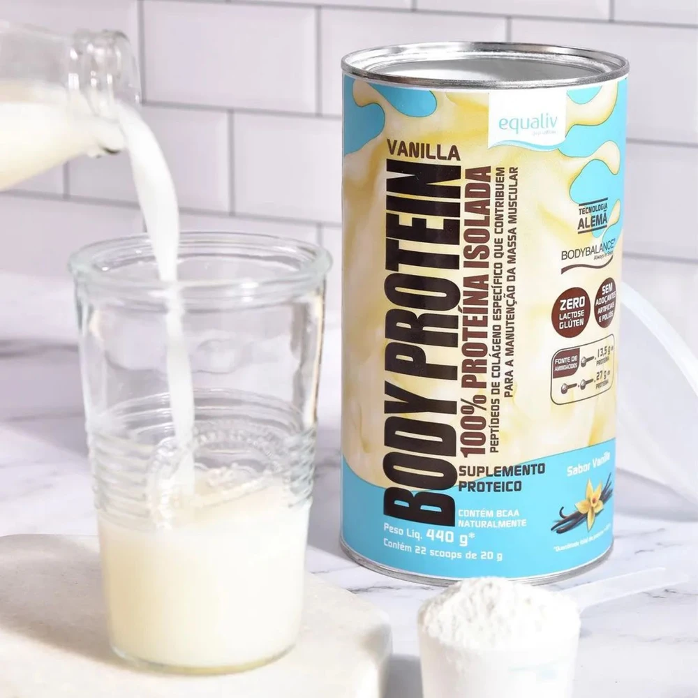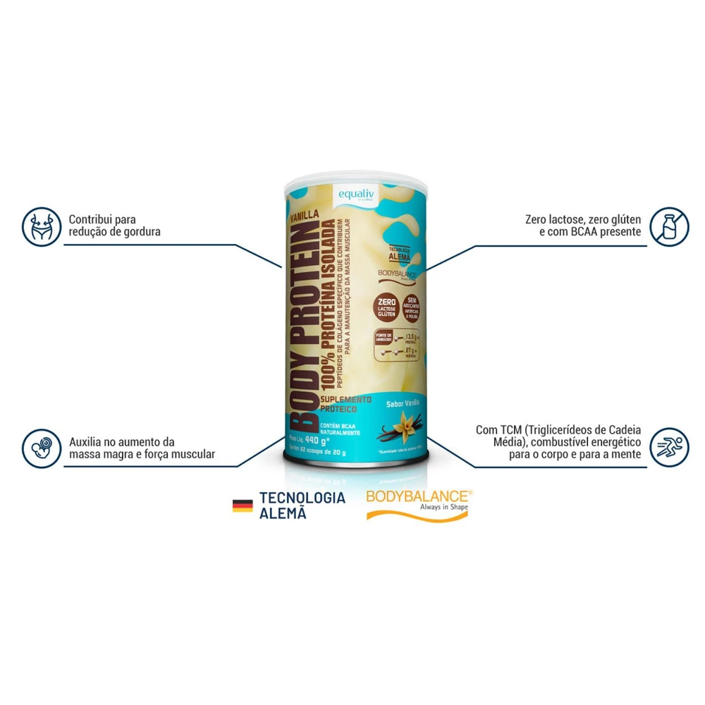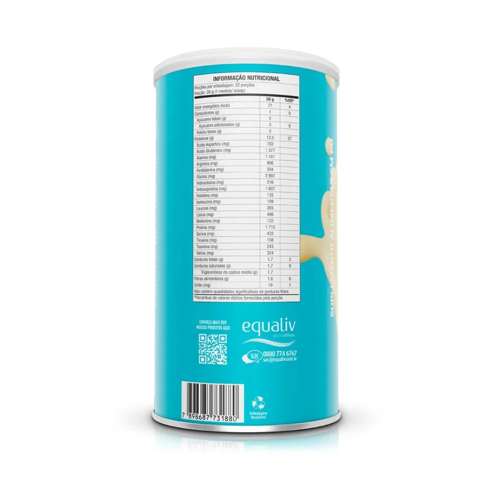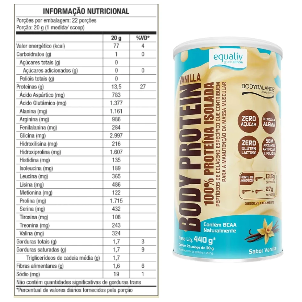 Equaliv Body Protein 440G Sabor VanillaContribui para redução de gordura;- zero lactose, zero glúten, e com bcaa presente;- auxilia no aumento da massa magra e força muscular;- com tcm (triglicerídeos de cadeia média), combustível energético para o corpo e para mente.Modo de uso: modo de usar: consumir de 20 g (1 medida/ 1 scoop) a 40 g (2 medidas/ 2 scoops) ao dia, antes e/ou depois do treino ou conforme orientação do médico e/ou nutricionista. Modo de preparo: adicionar de 20 g (1 medida/ 1 scoop) a 40 g (2 medidas/ 2 scoops) de body protein vanilla para cada 100 ml de água ou bebida de sua preferência, agitando até dissolver. Para consistência mais cremosa, adicione menos água e/ou utilize um mixer.Ingredientes: colágeno hidrolisado, triglicerídeos de cadeia média em pó, (aromatizantes) aromas naturais de baunilha, (antiumectante) dióxido de silício, (espessante) goma xantana e (edulcorantes naturais) taumatina e glicosídeos de esteviol. não contém glúten sem adição de açúcares.