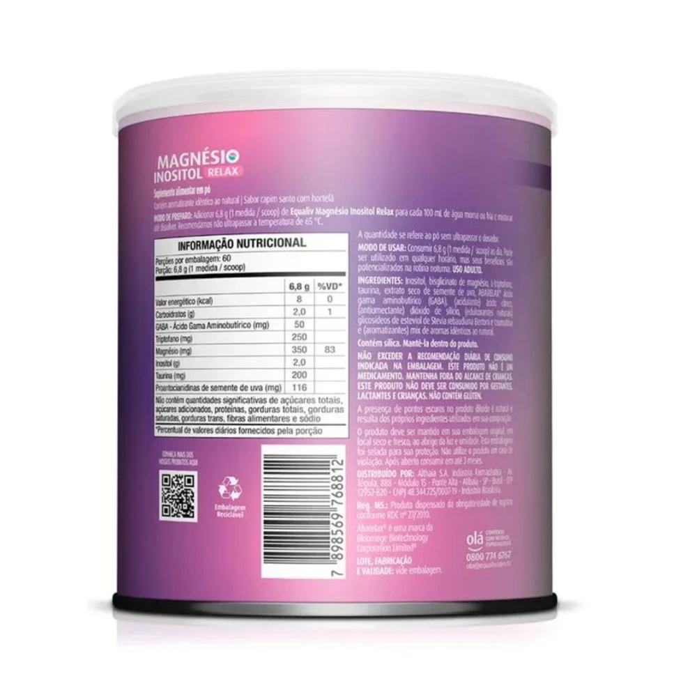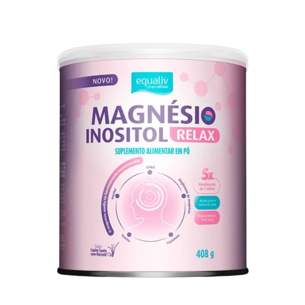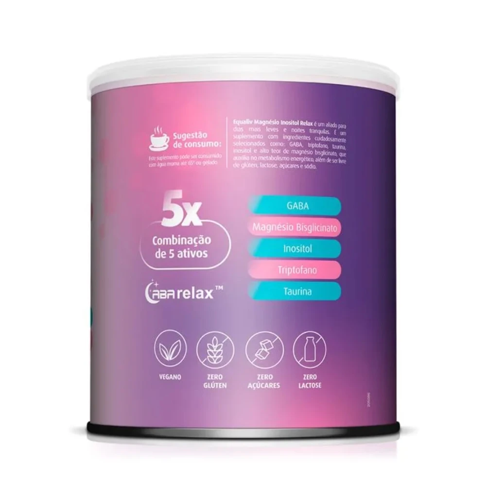 Apresentamos o novo Magnésio Inositol Relax Gaba 408 g da Equaliv: o suplemento em pó pensado para elevar sua qualidade de vida com ingredientes naturais e funcionais. Com sabor de capim-limão e hortelã, esse lançamento combina cinco ativos-chave ? GABA, Magnésio Bisglicinato, Inositol, L-Triptofano e Taurina ? que promovem relaxamento profundo, reduzem o estresse e melhoram a qualidade do sono de forma prática e sem abrir mão de um estilo de vida saudável. É vegano e livre de glúten, açúcar e lactose, com rendimento para até 60 doses. A dose indicada é de 6,8 g (1 scoop) diluída em água, quente ou fria ? idealmente à noite, para potencializar o descanso