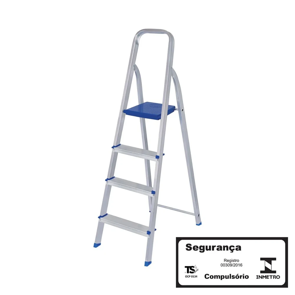 Para realizar aqueles consertos rápidos em casa com muita segurança, nada melhor do que ter uma escada que propicie conforto e que mantenha você firme no momento da utilização. Por isso a Mor elaborou para você uma linha de escadas completamente confiável, desenvolvidas com as melhores e mais seguras peças. Dobrável e fácil de guardar, a Escada de Alumínio 4 Degraus é ideal para pequenos consertos e para alcançar lugares mais elevados no uso doméstico. Este modelo possui quatro degraus com estrutura e chapas em alumínio, material super leve, durável (mesmo em áreas litorâneas!) e com peças plásticas em polipropileno de alta resistência. Além disso, seus pés antiderrapantes e travamento automático na plataforma superior garantem maior estabilidade para suportar até 120 Kg. As Escadas de alumínio Mor são fabricadas de acordo com a nova portaria do INMETRO N° 219, de 06 de maio de 2021, o que garante a certeza de um excelente produto. Possuem três anos de garantia.