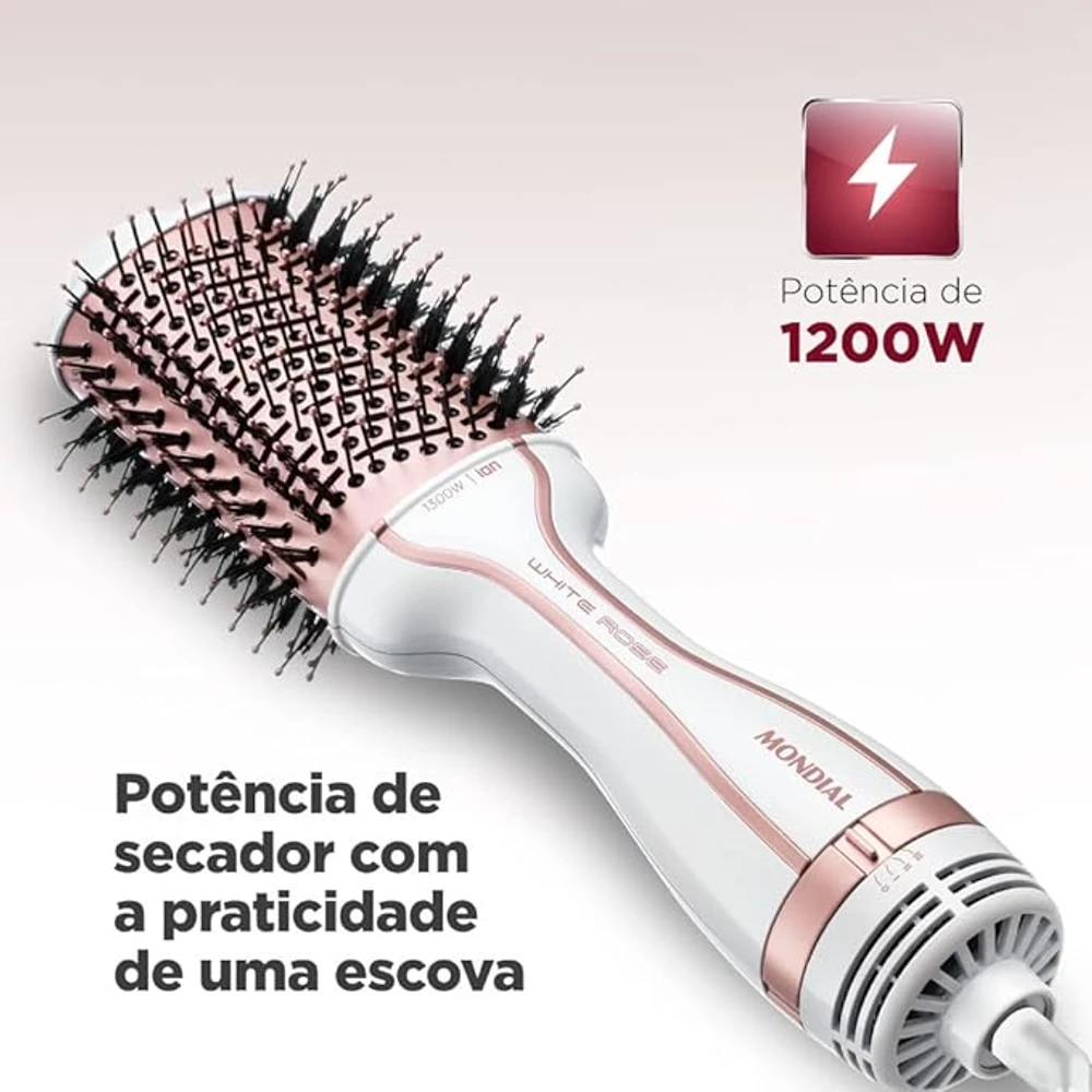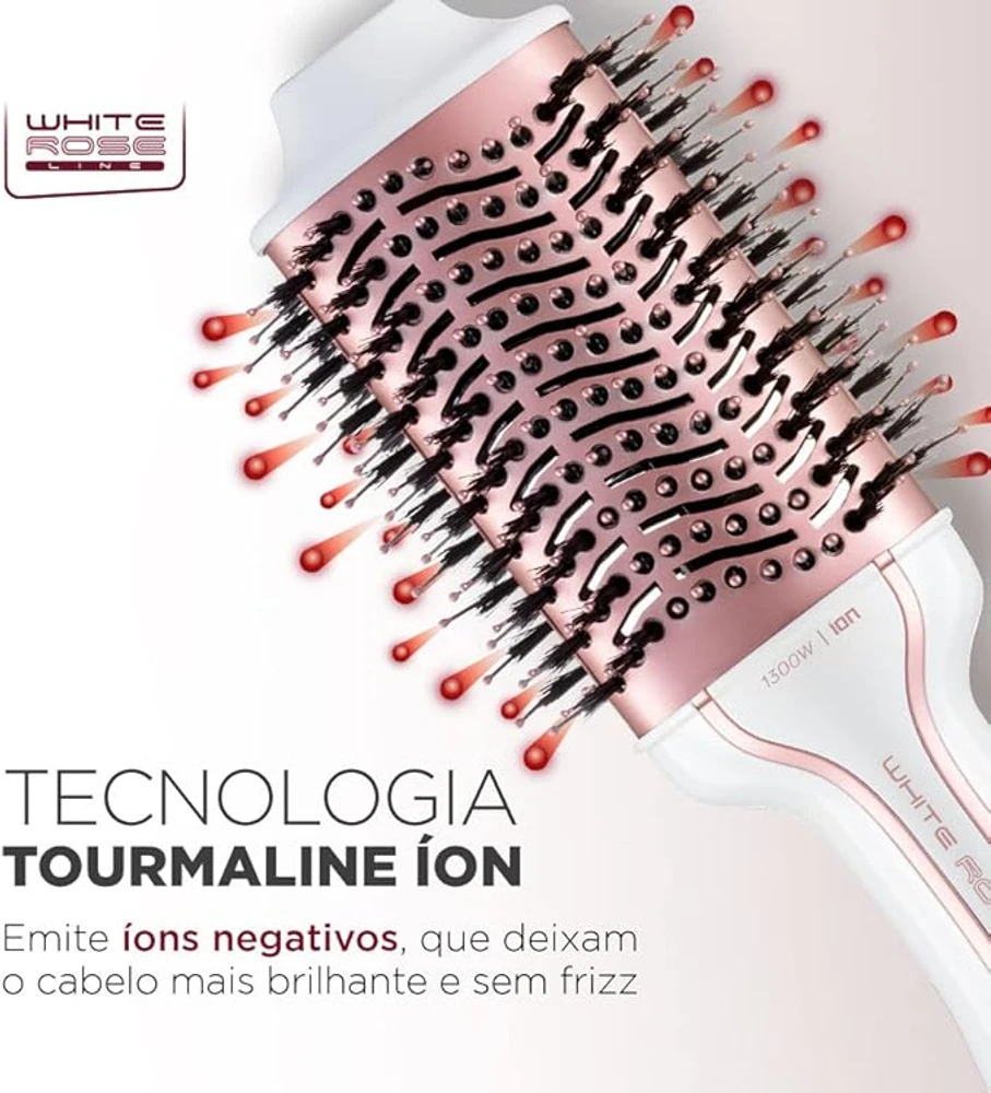 A praticidade da escova com o poder do secador! A Escova Secadora White Rose ES-50 é a 3 em 1 que vai mudar a sua rotina: você seca, alisa e modela os cabelos com apenas uma mão. O produto também possui revestimento cerâmico com Tourmaline Íon , tecnologia que emite íons negativos e fecha as cutículas dos fios, deixando-os mais macios e brilhantes.