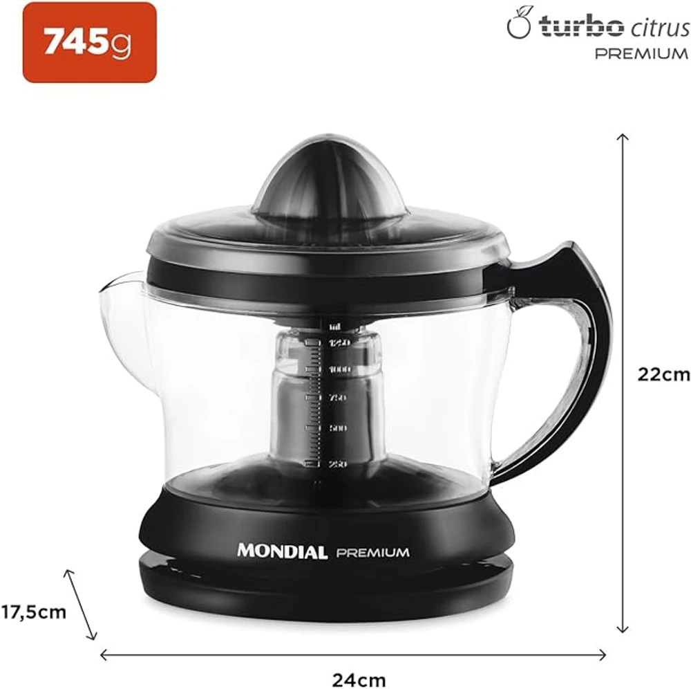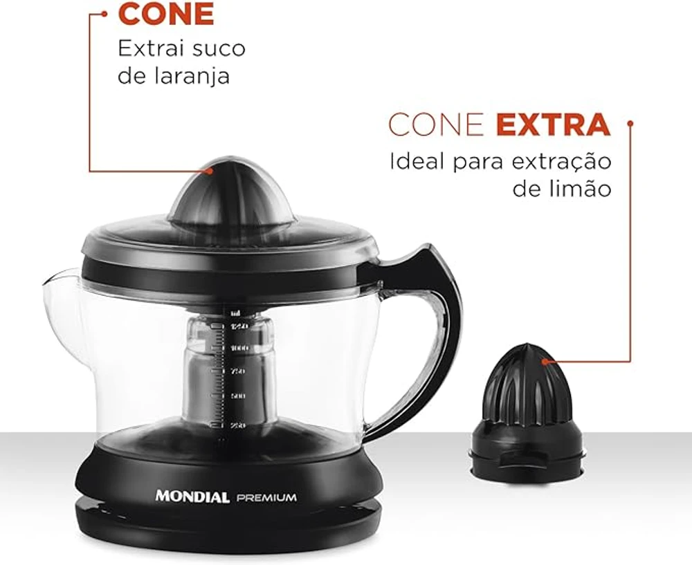Com o Espremedor Turbo Citrus Premium Mondial E-02 você faz sucos deliciosos de forma rápida e preserva o frescor da fruta. A capacidade de 1,25 litros produz bastante suco e basta pressionar a fruta no espremedor para acionar o equipamento. Acompanha cone extra para você escolher seu suco favorito, com o máximo rendimento. Conta ainda com dupla rotação e tampa de proteção.
