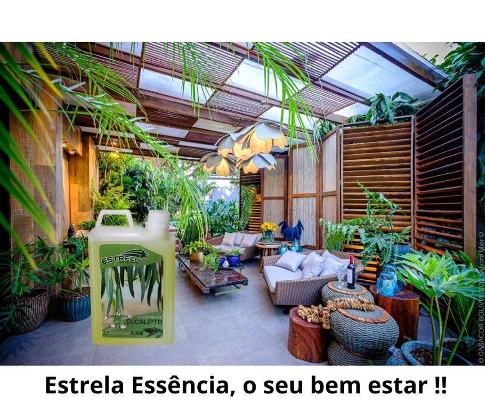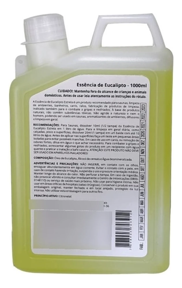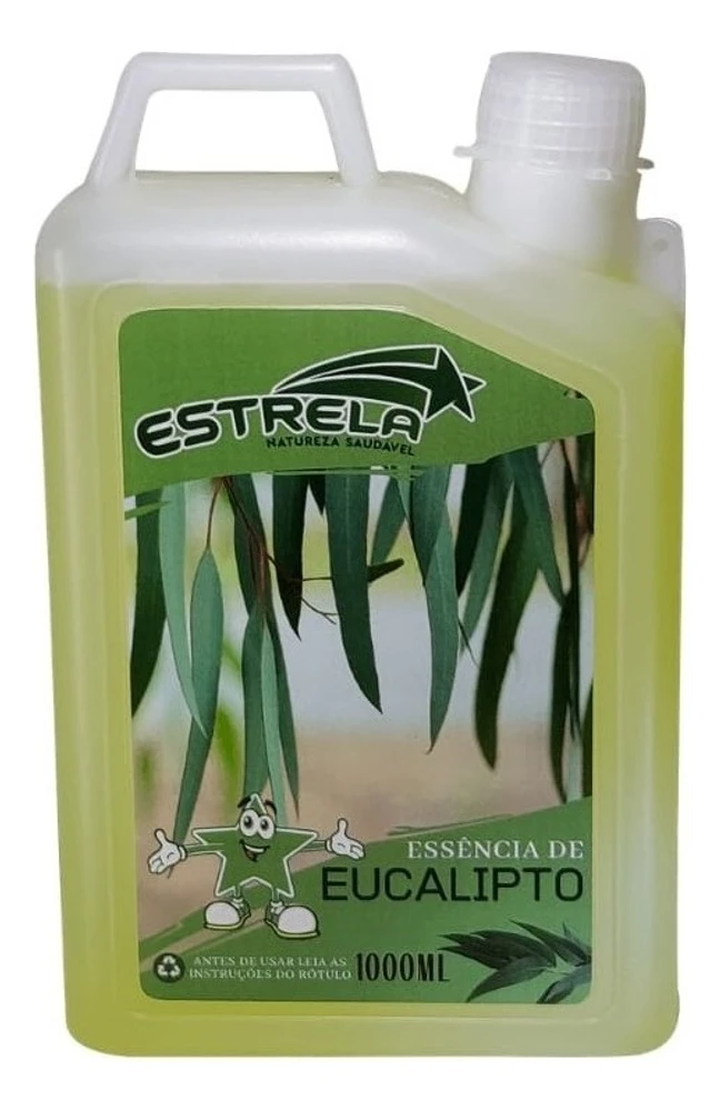 A Essência de Eucalipto Estrela é um produto recomendado para saunas, limpeza de ambientes, banheiros, canis, ralos e uso geral. Indicado também para o combate a gripes e resfriados. À base de produtos naturais, o oleo de eucalipto é a base para a essencia, não contém substâncias tóxicas. Não agride a natureza e nem o homem. Indicado para superfícies como calçadas, banheiros, cozinhas, as quais contenham pisos e azulejos. Embalagem 1 litro.