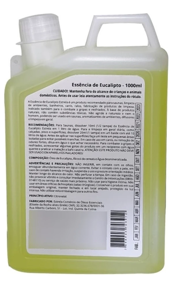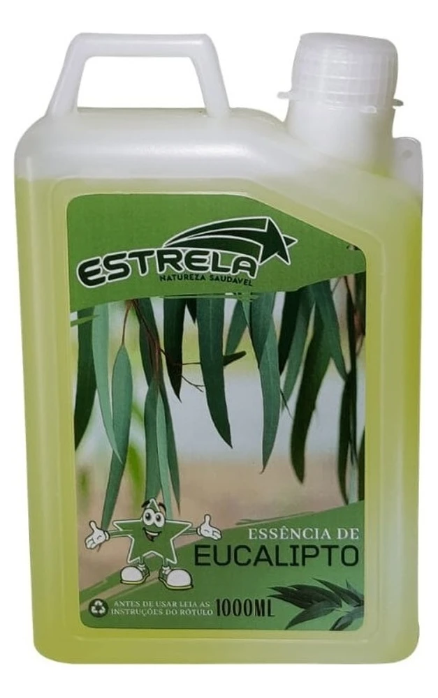 Essência De Eucalipto Natural Para Sauna 1 LitroA Essência de Eucalipto Estrela é um produto recomendado para saunas, limpeza de ambientes, banheiros, canis, ralos e uso geral. Indicado também para o combate a gripes e resfriados. À base de produtos naturais, o oleo de eucalipto é a base para a essencia, não contém substâncias tóxicas. Não agride a natureza e nem o homem. Indicado para superfícies como calçadas, banheiros, cozinhas, as quais contenham pisos e azulejos. Embalagem 1 litro.As essências são indicadas para aplicação em saunas seca ou úmida, produto também pode ser utilizado à limpeza geral ou aromatização de ambientes. Composto por óleo essencial natural da planta, solubilizante e veículo. Produto já preparado para utilização.Utilização em canis, gatis e ambientes com cheiro forte de animais, pode ser borrifado ou misturado a água da limpeza. Utilização em ralos de pia ou banheiro, vaso sanitário, etc...Em esclarecimento aos nossos clientes sentimos a necessidade de especificar o as diferenças em óleo essencial, essência, fragrância sintética.Óleo essencial é uma substância extraída, por processo de destilação ou maceração de plantas, galhos e folhas, portanto um produto natural, seu aspecto é oleoso e concentrado, quanto a concentração ela tem um limite, este por ser natural não pode ser intensificado artificialmente para não perder as propriedades.Óleos essenciais, possuem diversas aplicações, algumas delas são: aromoterapia, cosméticos, produção de essências, etc...Essência tem aspecto liquido podendo ser oleoso ou hidrossolúvel, resultado de óleo essencial diluído, muitos também chamam de essência líquidos oleosos ou não de procedência sintética (fragrância), os sintéticos podem possuir outros componentes químicos como solventes, intensificadores de fragrância, fixadores e comumente são utilizados na produção de produtos de limpeza, ceras, velas, aromatizantes, etc...Já as essências naturais podem ser utilizadas na produção de produtos aromoterápicos em cosméticos, etc...Em ambos os casos elas tem um objetivo em comum que é o de fazer com que o produto final exale uma fragrância.O nome essência é utilizado para este produto por se tratar de óleo essencial solubilizado e diluído a uma determinada concentração... E demais componentes, pois se fosse um único componente, daí o nome seria óleo essencial e não essência.A essência para sauna da Estrela tem em sua composição o óleos essenciais como um dos componentes do produto final, estes óleos essencial precisam ser solubilizado pois se assim não forem eles não vão se misturar em água ou álcool quando na produção de outros produtos.Intensidade de fragrância é uma questão muito pessoal e delicada para se lidar, pois o que é suave para uns, pode ser intenso e até mesmo extra forte para outros, portanto para este produto é definido uma intensidade onde é estipulado um percentual limite de óleo essencial, para que não cause problemas aos usuários, este cuidado não ocorre quando o produto é comparado com essências de eucalipto com maior concentração, com intensificadores de fragrâncias ou outros produtos sintéticos, portanto se o produto não diz em seu rótulo que pode ser utilizado em sauna, ele pode até ter uma intensidade maior ou fragrância agradável, porém pode conter componentes não indicados a inalação.