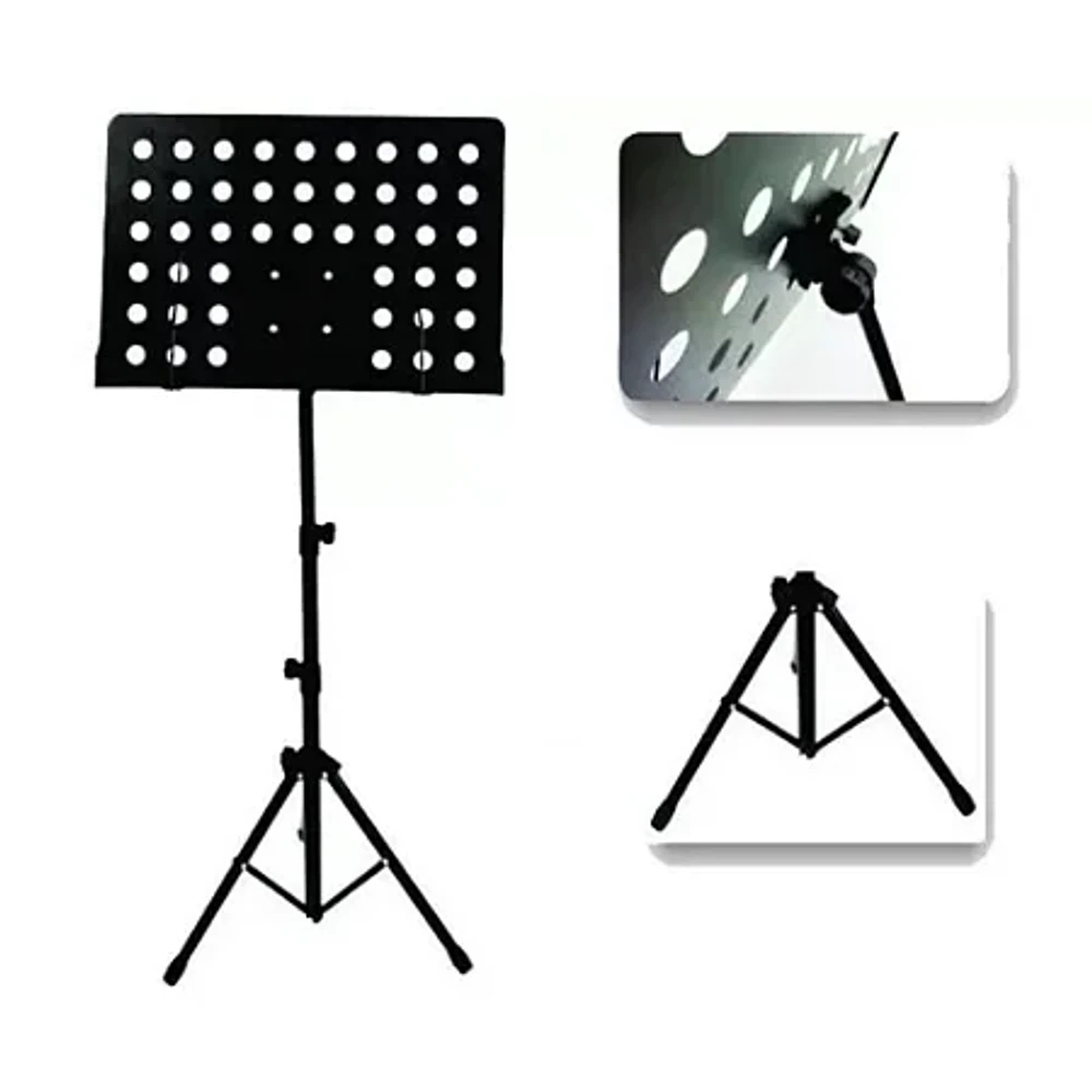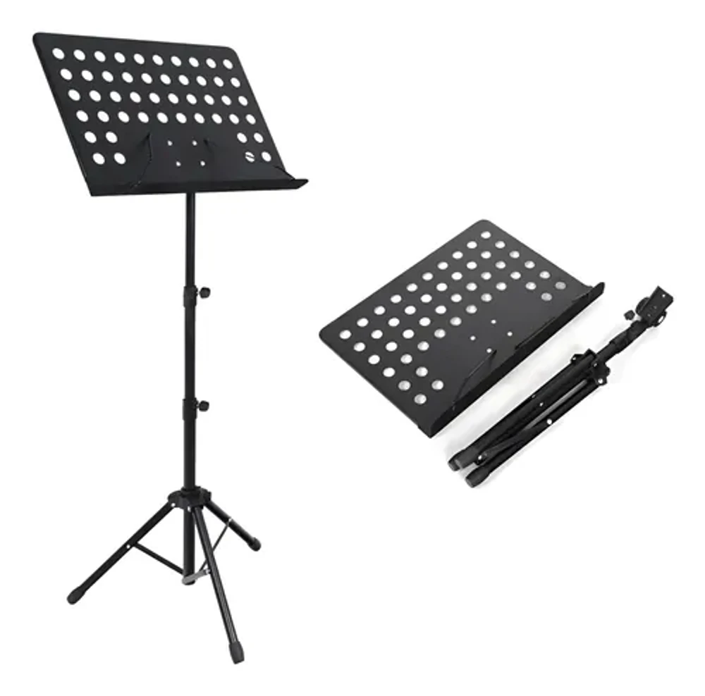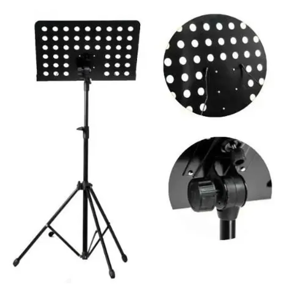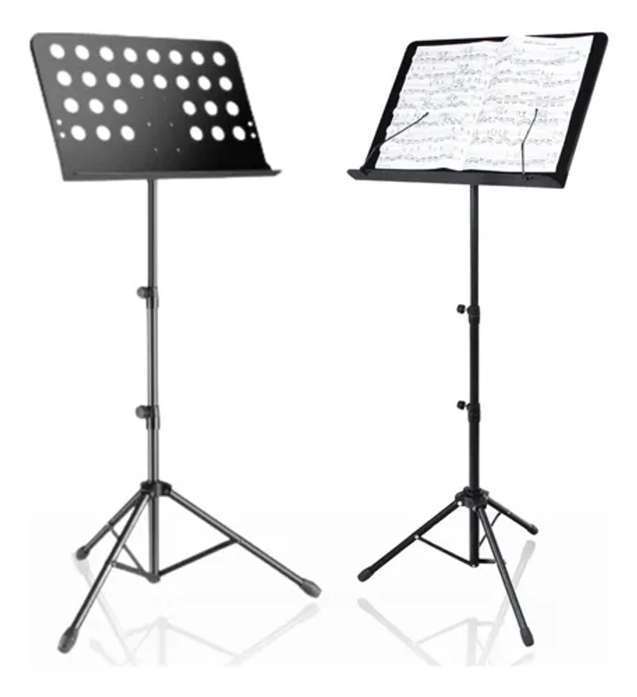 Tampo perfurado (tipo maestro) com aba frontal que impede a queda das páginas; suporta partituras, pastas e tablets.