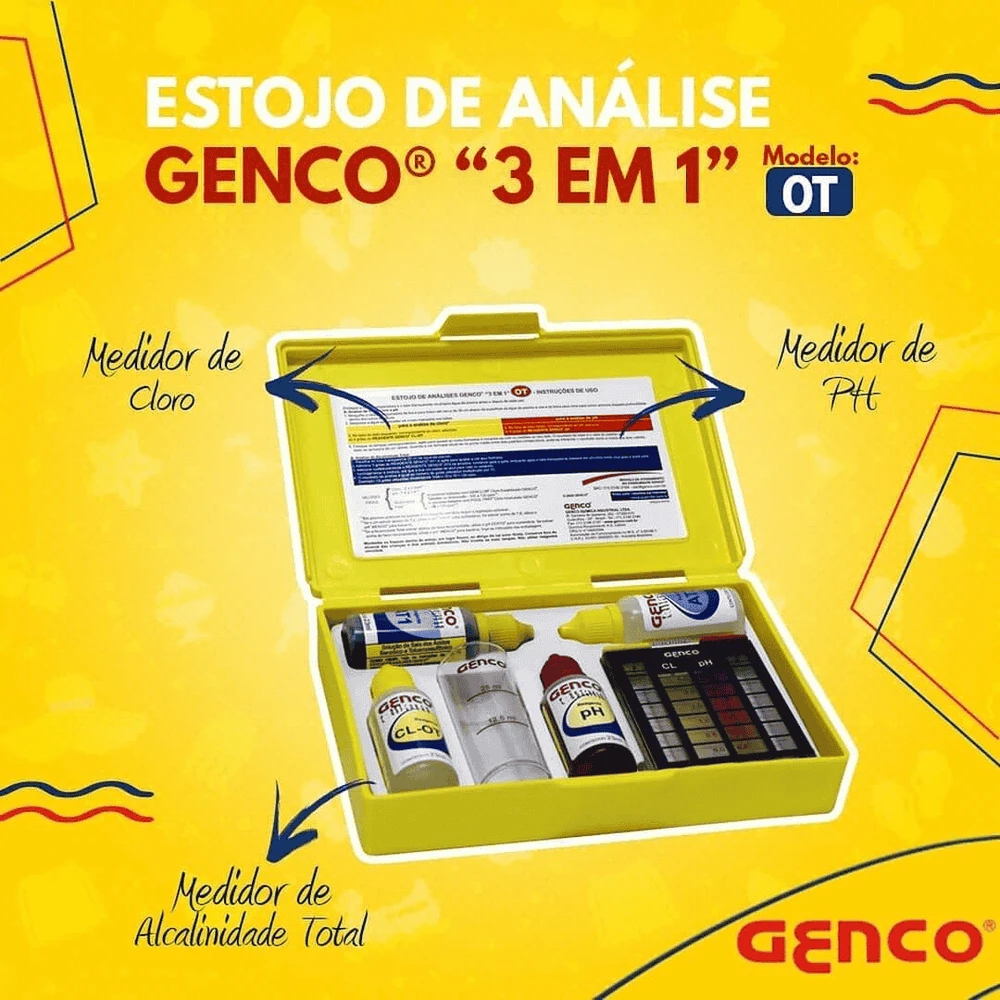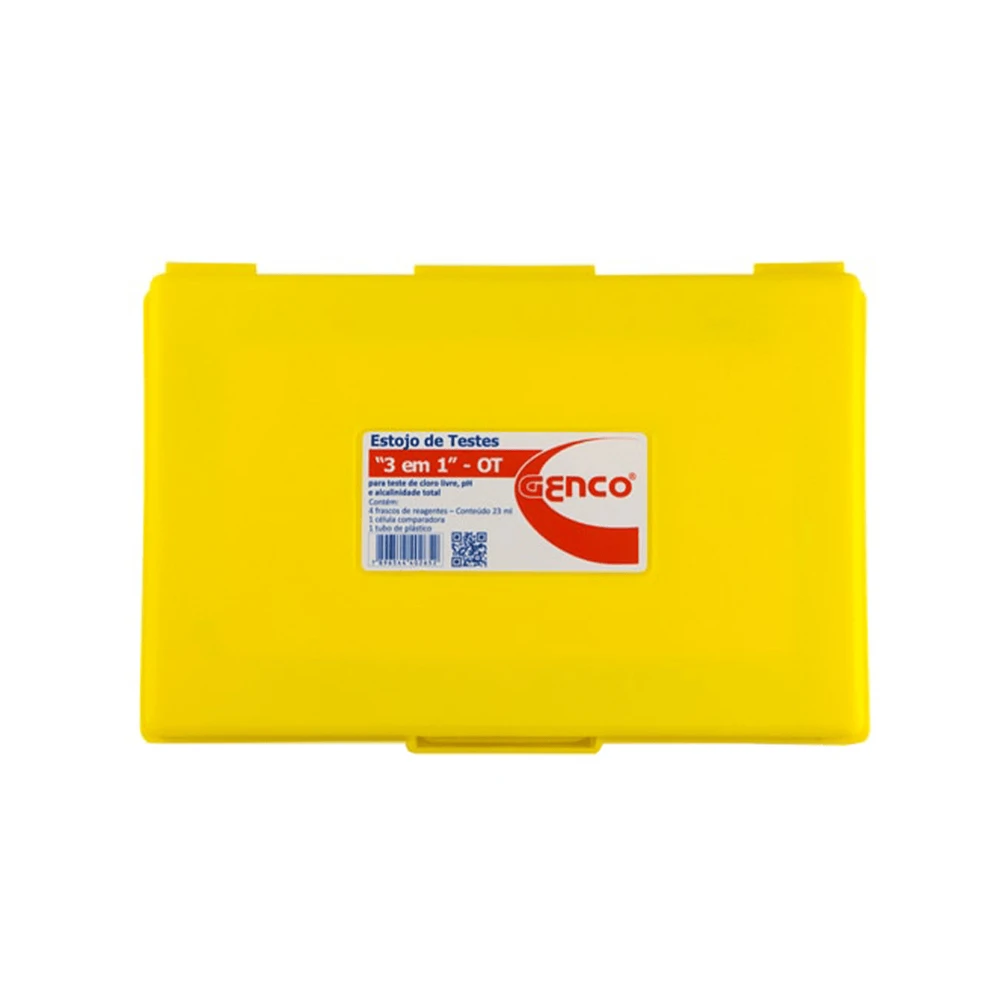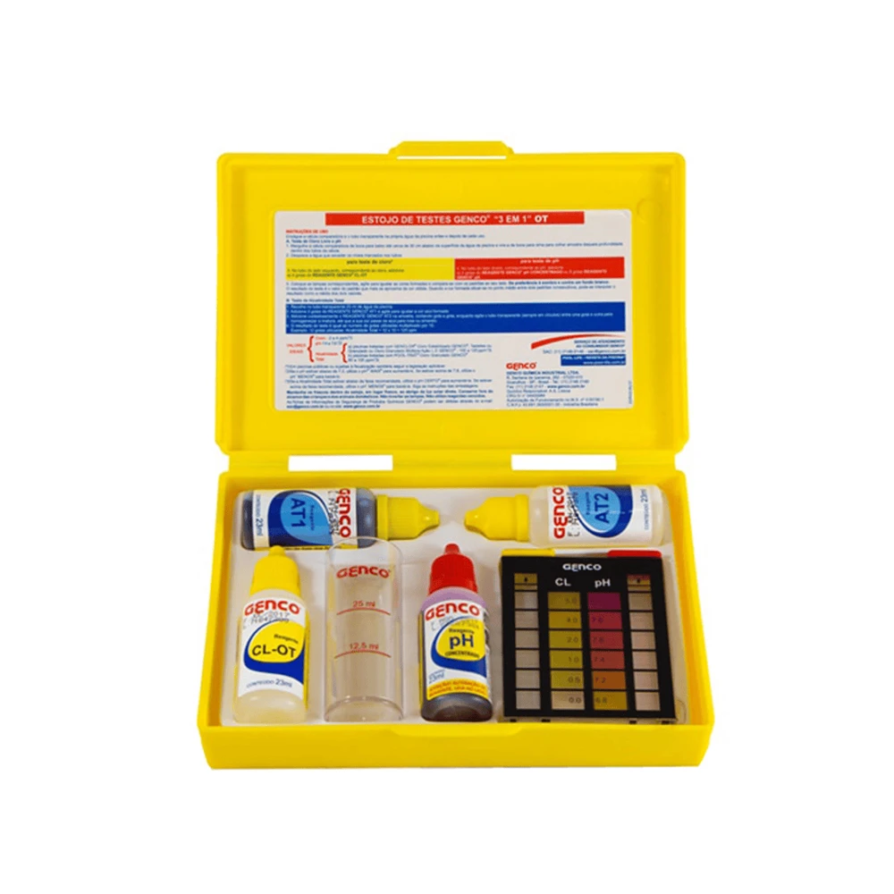 Estojo de Testes GENCO® "3 em 1" - OT mede cloro livre, pH e alcalinidade total da água da piscina de maneira rápida e simples.