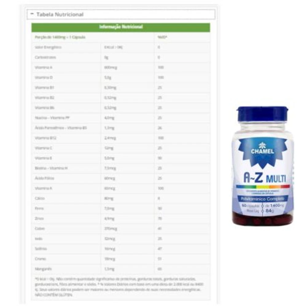 1) AZ Multi Polivitamínico, que fornece uma ampla gama de nutrientes essenciais para apoiar a saúde geral do corpo. Cada frasco contém 60 cápsulas de 1400mg, para que você possa ter certeza de que está recebendo a dose certa todos os dias.