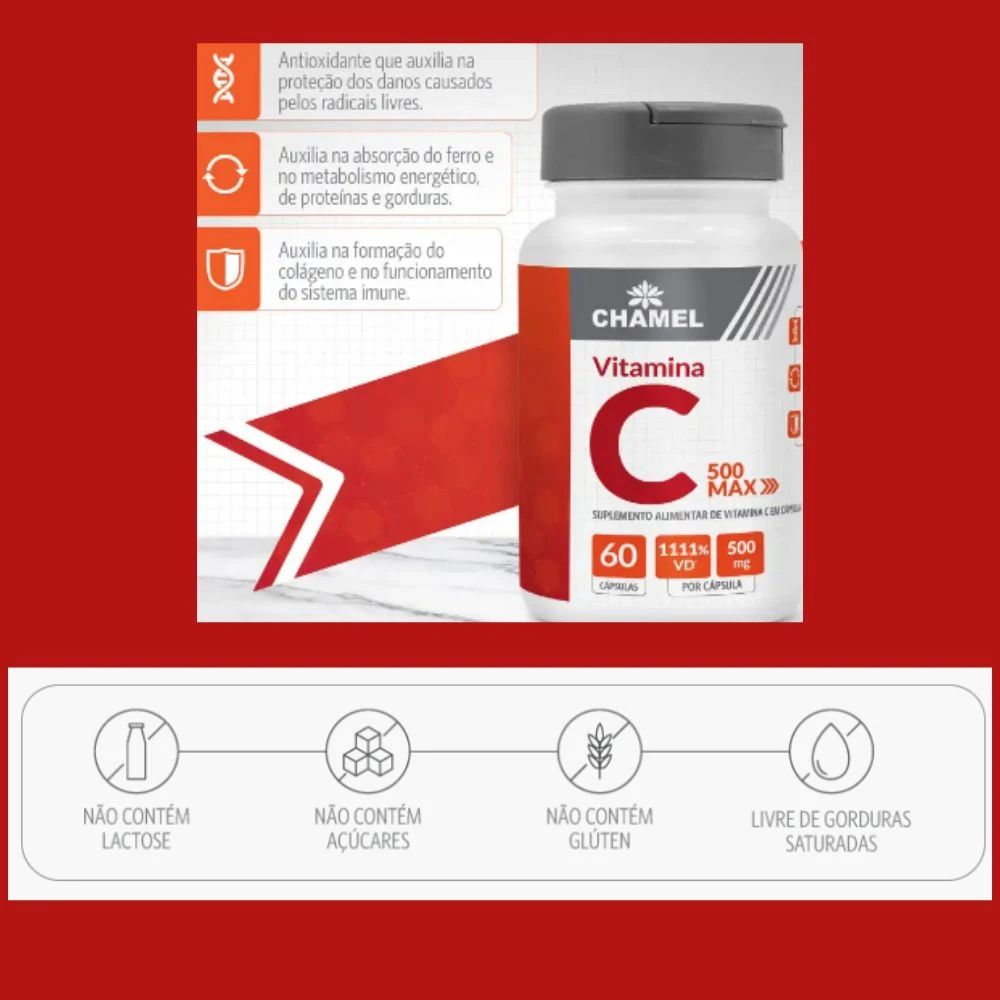 3) Max Vitamina C 500mg, (com 60 cápsulas) ,que são uma maneira fácil e eficaz de aumentar sua ingestão diária de vitamina C. A vitamina C é um antioxidante importante que ajuda a proteger o corpo contra danos causados por radicais livres .
