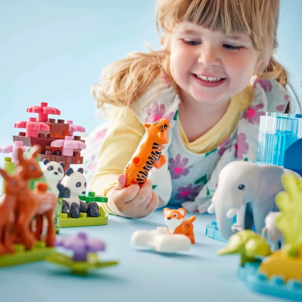 Este brinquedo para crianças pequenas apresenta uma cena de savana onde uma tigresa e um filhote de tigre se alimentam de um osso e depois brincam nas pedras, e uma figura de elefante leva seu filhote até uma cachoeira. As crianças usam habilidades motoras finas enquanto prendem o bebê na cauda do elefante adulto. Na praia, as figuras de tartarugas estão botando ovos. Na floresta, a figura de panda e seu filhote brincam sob a flor de cerejeira, enquanto figuras fofas de veados pastam na clareira.