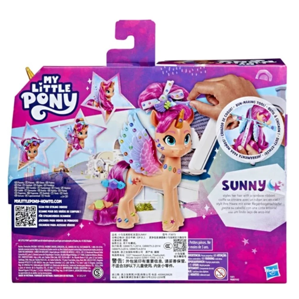 No filme My Little Pony: A New Generation e na série My Little Pony: Make Your Mark, ela se torna um Alicórnio com penteados de arco-íris. O brinquedo Penteados com Fitas Sunny Starscout inclui 1 figura de pônei laranja de 15 cm com Cutie Mark de estrela cadente na lateral. A figura tem cabelo rosa longo e macio para criar penteados diferentes!
