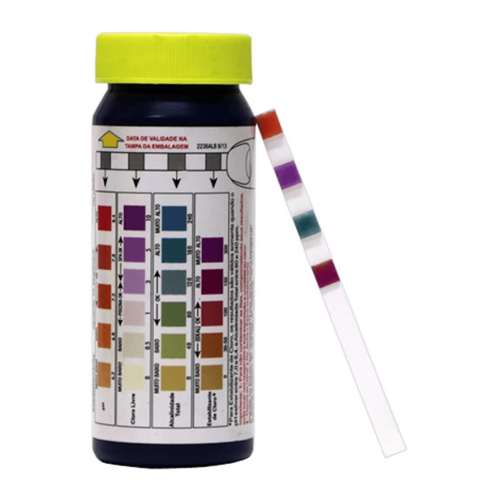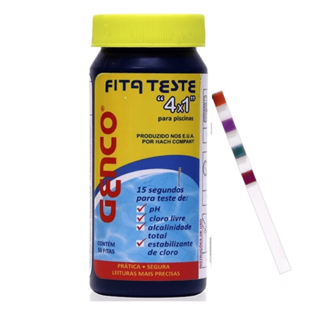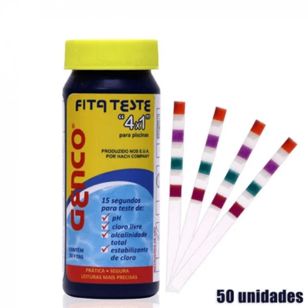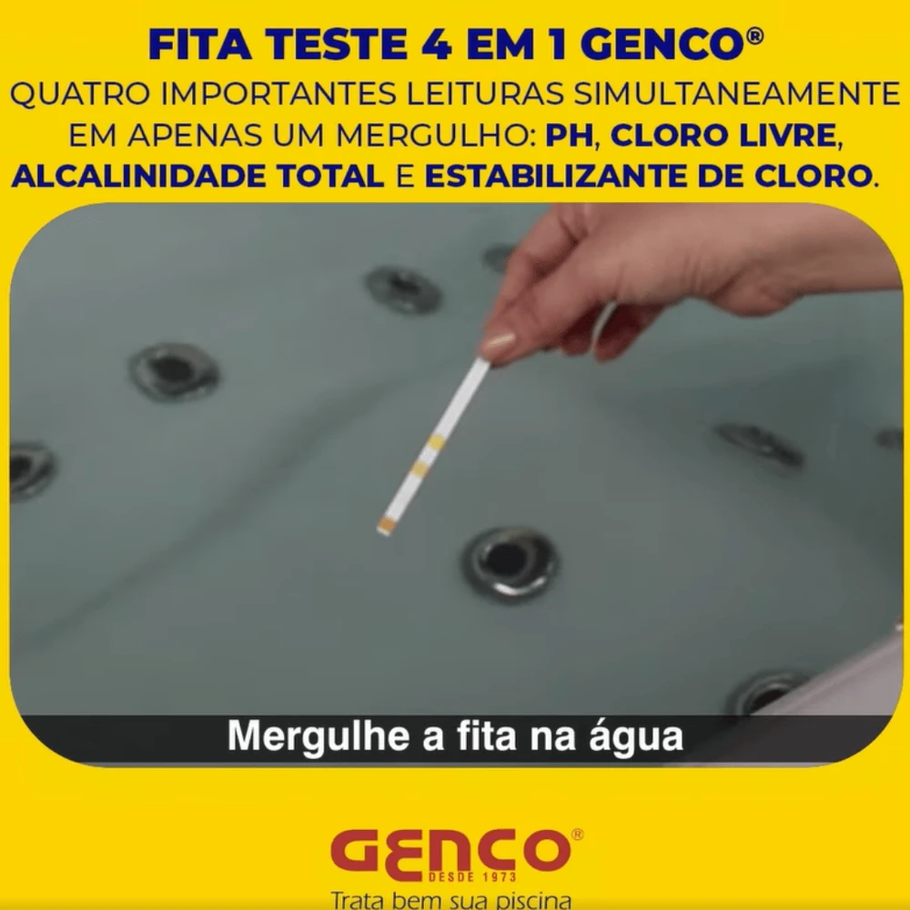 Descrição do produto:De maneira segura e prática a FITA TESTE "4 em 1" GENCO®, realiza quatro importantes leituras simultaneamente em apenas um mergulho: pH, cloro livre, alcalinidade total e estabilizante de cloro. pH:O pH indica de forma simples e objetiva se a água está ácida (pH inferior a 7), neutra (pH igual a 7) ou básica (pH superior a 7). O pH da água de piscinas deve ser mantido sempre dentro da faixa ideal para garantir eficácia à desinfecção do cloro, conforto dos banhistas e proteção dos equipamentos.Cloro:Somente a presença de cloro na água, pode garantir uma água saudável, ou seja, aquela que é mantida devidamente desinfetada, livre de germes (causadores ou não de doenças) e de outros microrganismos ou contaminantes que possam deteriorar seu aspecto, cor, odor ou comprometer a desinfecção e causar desconforto ao usuário.Alcalinidade Total:É extremamente importante que a Alcalinidade Total em águas de piscinas seja mantida entre 80 e 120 ppm (dependendo do cloro utilizado), pois isso confere estabilidade ao pH e facilita seu controle, melhora a atuação dos produtos utilizados no tratamento e a qualidade da água. Estabilizante de cloro:É a concentração de ácido cianúrico contido na água da piscina, proveniente dos cloros estabilizados. O ácido cianúrico é um composto que inibe a degradação do cloro pelos raios UV (raios solares).Instruções de uso:1) Mergulhe uma fita na água da piscina e remova-a imediatamente.2) Retire, sem chacoalahar o excesso de água e aguarde 15 segundos.3) Compare as cores obtidas na fita com os padrões impressos no rótulo.4) Com a fita em pé a primeira almofada de cima para baixo correponde ao pH, a segunda corresponde ao cloro livre, a terceira corresponde a alcalinidade total e a última corresponde ao estabilizante de cloro.* Para estabilizante de cloro, os resultados são válidos somente quando o pH estiver entre 7,0 e 8,4, e alcalinidade total entre 80 e 240 ppm.Importante:-Para não contaminar as fitas, comprometendo seus resultados, evite tocar nos reagentes e sua exposição a umidade ou calor.-Depois de retirar a fita, feche o frasco imediatamente.