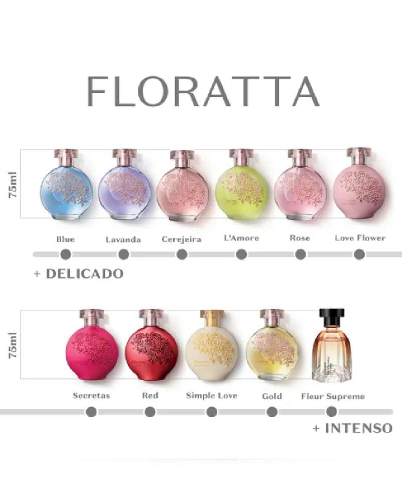 Além do desodorante colônia, a linha completa de Floratta Blue conta com vários produtos para potencializar a perfumação: Desodorante Body Spray, Floratta Blue Desodorante Colônia Pocket, Desodorante Antitranspirante Aerossol, Desodorante Antitranspirante Roll On, Creme Desodorante Hidratante para Mãos, Creme Hidratante Desodorante Corporal e Sabonetes.