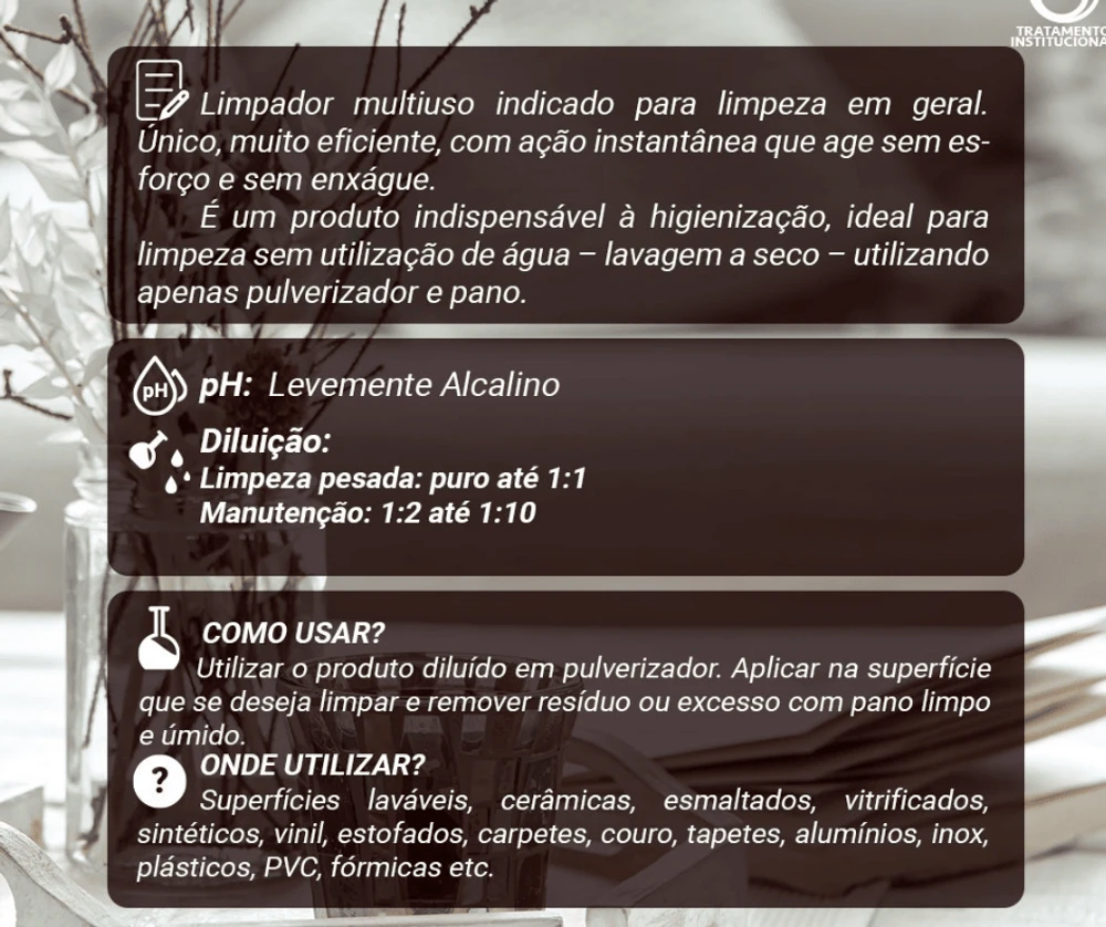 Único, muito eficiente, com ação de limpeza instantânea que age sem esforço e sem enxágue. É um produto indispensável à limpeza e higienização, ideal para limpeza sem utilização de água ? lavagem a seco ? utilizando apenas pulverizador e pano.