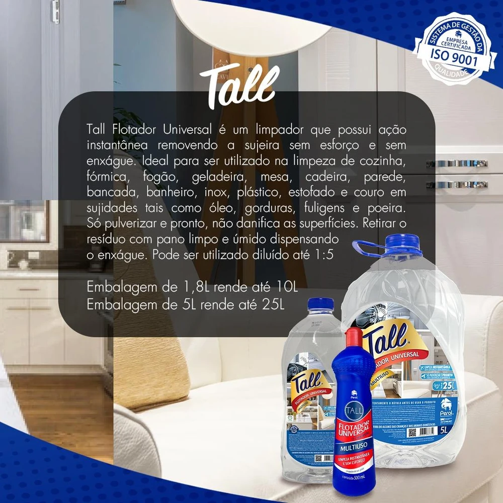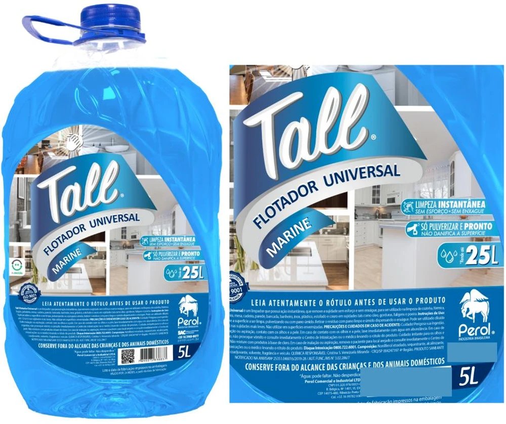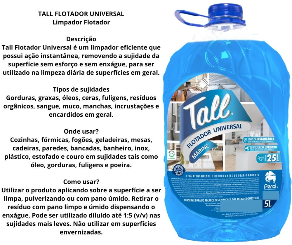 Tall Flotador Universal é um limpador eficiente que possui ação instantânea, removendo a sujidade da superfície sem esforço e sem enxágue, para ser utilizado na limpeza diária de superfícies em geral.