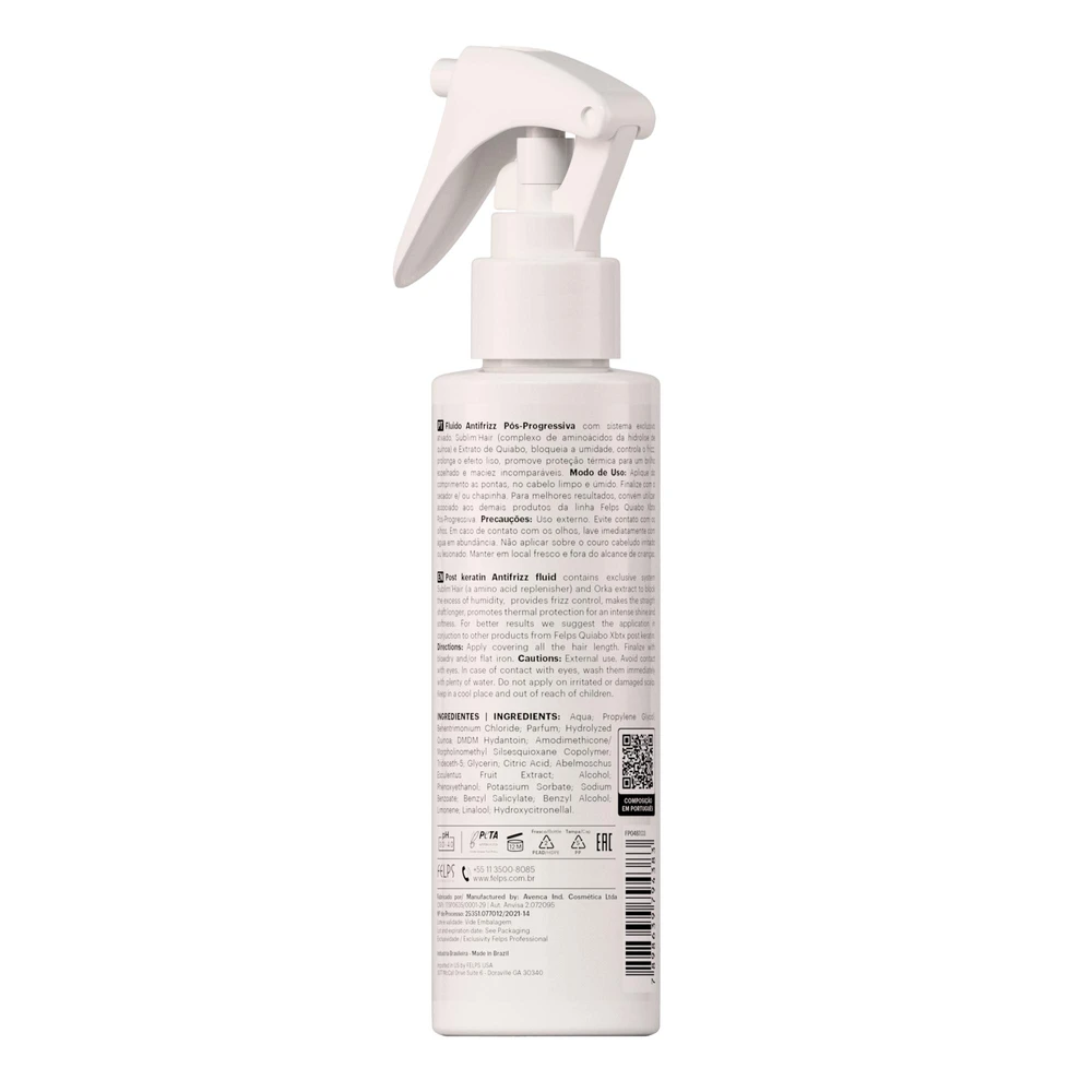 Fluído Antifrizz Pós-Progressiva com sistema exclusivo ativado, Sublim’Hair (complexo de aminoácidos da hidrólise de quinoa) e Extrato de Quiabo bloqueia a umidade, controla o frizz, prolonga o efeito liso, promove proteção térmica para um brilho espelhado e maciez incomparáveis.