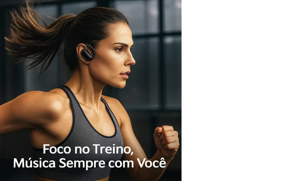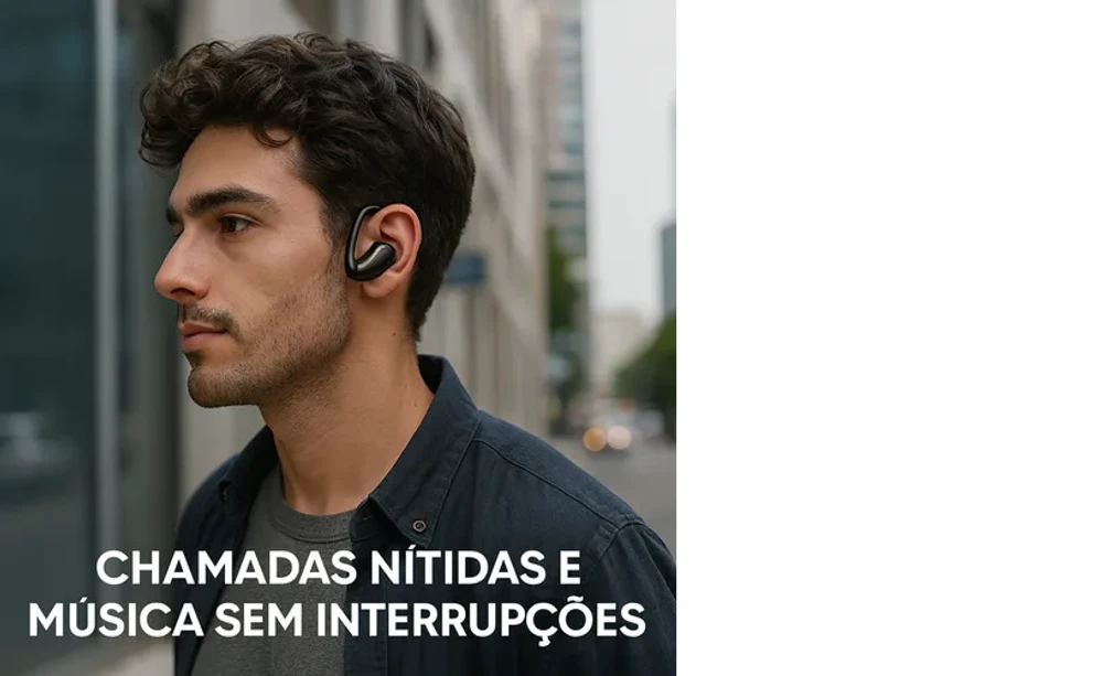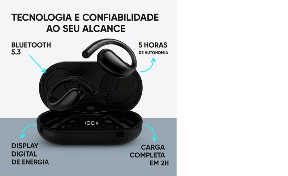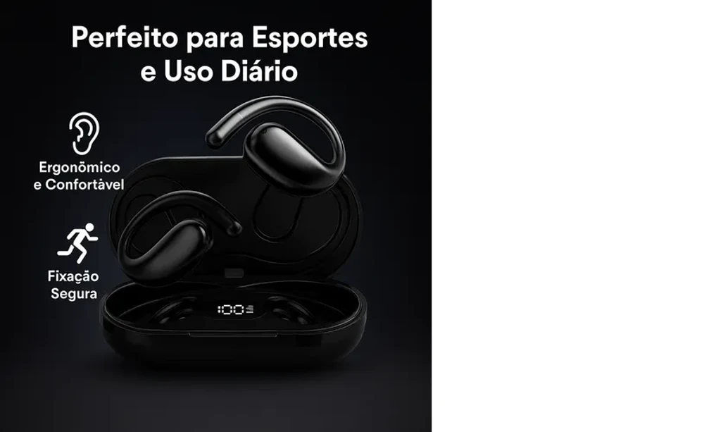 Gancho ergonômico que se ajusta perfeitamente à orelha, ideal para corridas, treinos e uso diário.