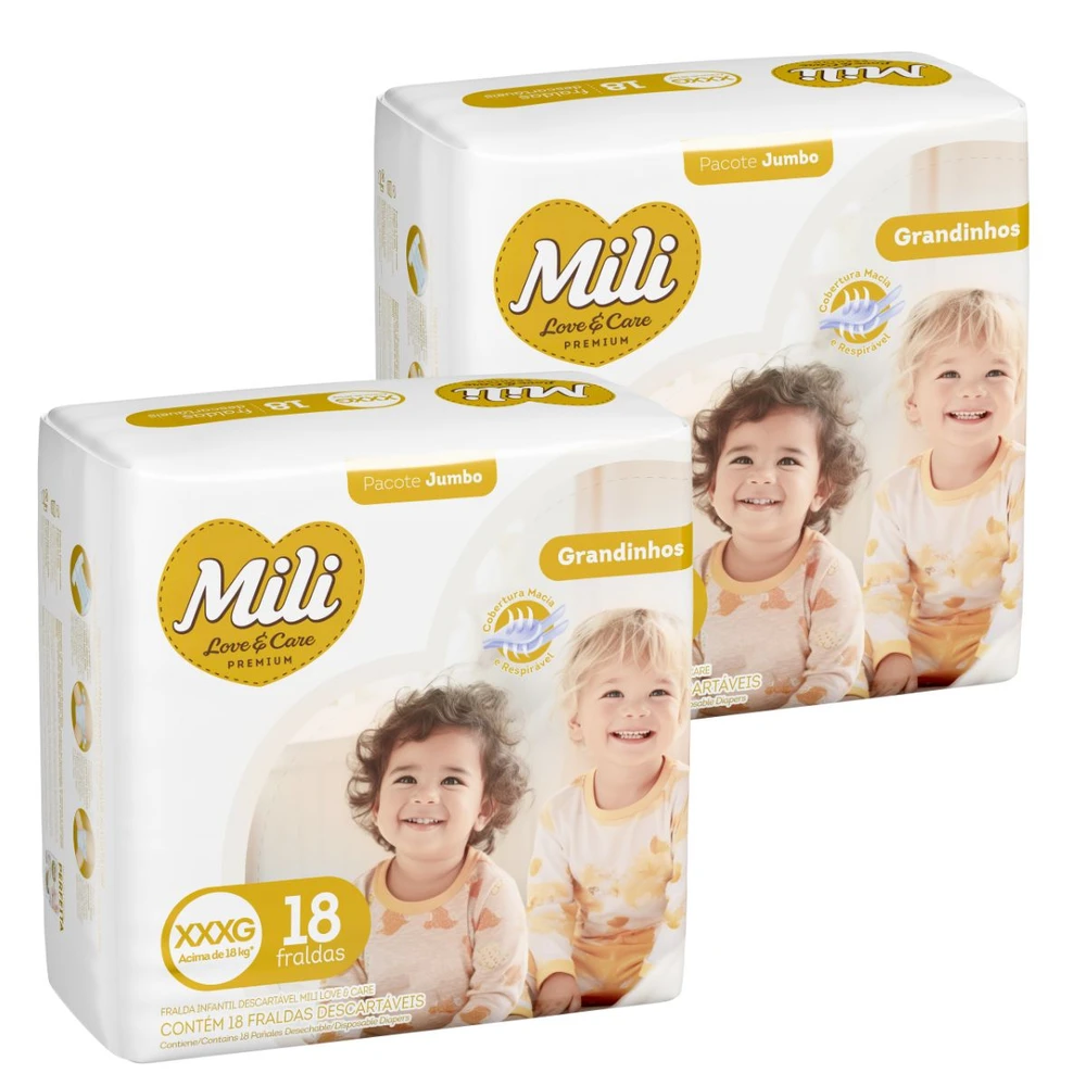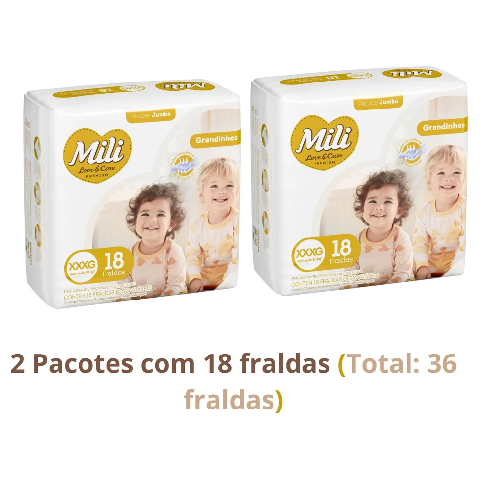 Fralda Descartável Mili Love & Care Linha Premium Tamanho: XXXG (indicado para bebês acima de 18 kg - Grandinho) Quantidade: 2 Pacotes com 18 fraldas (Total: 36 fraldas) Marca: Mili Fralda confeccionada pela moderna tecnologia Mili que vai atender as expectativas de quem procura o melhor para o seu bebe: qualidade, conforto e praticidade. A Mili Love & Care é uma fralda que vai surpreender você. Oferece todo o cuidado e suavidade que seu filho precisa para ficar sempre sequinho e confortável. A pele respira mais, a fralda se ajusta bem e o bebê se sente melhor. -Toque macio - Gel absorvente - Abas elásticas - Com extrato de algodão - deixa a pele respirar - Máxima proteção - 6 camadas que deixam o bebê protegido e sequinho - Conforme ficha técnica do produto ,