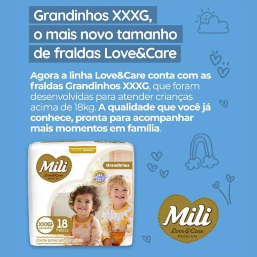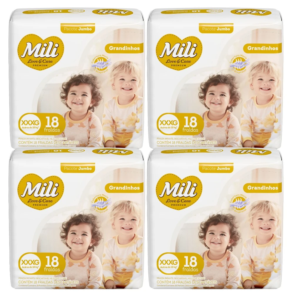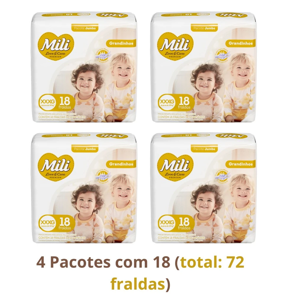 Fralda Descartável Mili Love & Care Linha Premium Tamanho: XXXG (indicado para bebês acima de 18 kg - Grandinho) Quantidade: 4 Pacotes com 18 fraldas (Total: 72 fraldas) Marca: Mili Fralda confeccionada pela moderna tecnologia Mili que vai atender as expectativas de quem procura o melhor para o seu bebe: qualidade, conforto e praticidade. A Mili Love & Care é uma fralda que vai surpreender você. Oferece todo o cuidado e suavidade que seu filho precisa para ficar sempre sequinho e confortável. A pele respira mais, a fralda se ajusta bem e o bebê se sente melhor. -Toque macio - Gel absorvente - Abas elásticas - Com extrato de algodão - deixa a pele respirar - Máxima proteção - 6 camadas que deixam o bebê protegido e sequinho - Conforme ficha técnica do produto ,