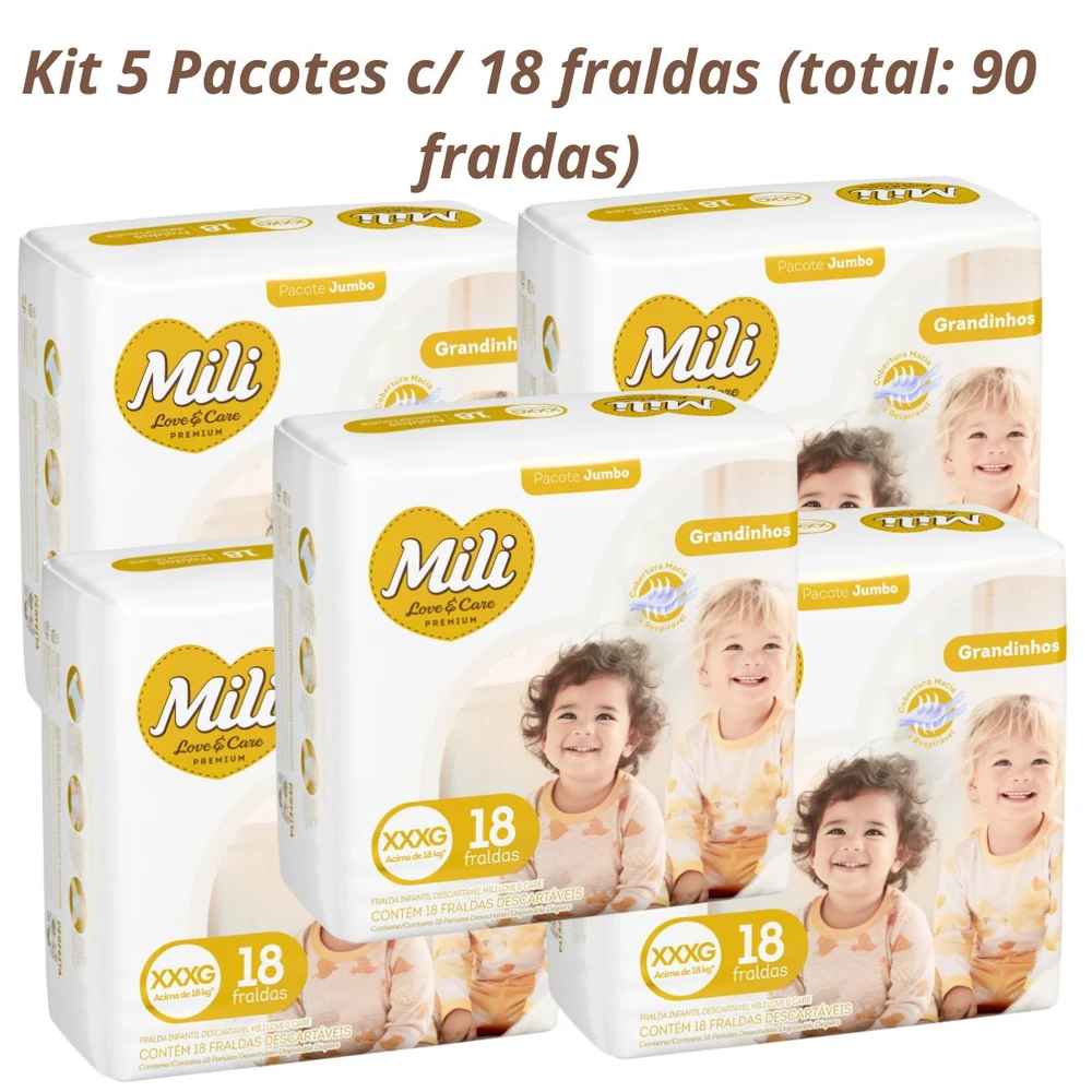 Fralda Descartável Mili Love & Care Linha Premium Tamanho: XXXG (indicado para bebês acima de 18 kg - Grandinho) Quantidade: 5 Pacotes com 18 fraldas (Total: 90 fraldas) Marca: Mili Fralda confeccionada pela moderna tecnologia Mili que vai atender as expectativas de quem procura o melhor para o seu bebe: qualidade, conforto e praticidade. A Mili Love & Care é uma fralda que vai surpreender você. Oferece todo o cuidado e suavidade que seu filho precisa para ficar sempre sequinho e confortável. A pele respira mais, a fralda se ajusta bem e o bebê se sente melhor. -Toque macio - Gel absorvente - Abas elásticas - Com extrato de algodão - deixa a pele respirar - Máxima proteção - 6 camadas que deixam o bebê protegido e sequinho 25351.194038/2019-01 (nº notificação anvisa) - Conforme ficha técnica do produto ,