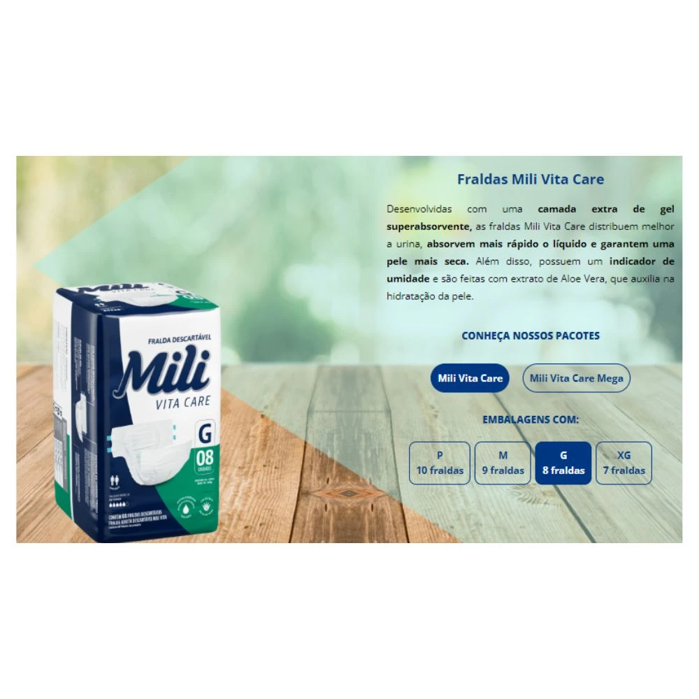 As fraldas estão construídas para melhor desempenho em conforto e absorção. Pensada para oferecer cuidado e bem-estar em todos os momentos da vida, a fralda Mili Vita contém extrato de aloe vera que preserva a hidratação da pele, e a alta absorção é garantida pelo exclusivo Techgel. Um indicador de umidade muda de cor e permite acompanhar se a fralda está no limite do uso à medida em que aumenta a quantidade de líquido absorvido. A linha Mili Vita é recomendada para uso geriátrico e em casos de incontinência. Mas também é indicada para situações de pós-operatório e pós-parto. Barreiras anti-vazamentos e quatro fitas adesivas reposicionáveis permitem abrir e fechar conforme necessário, para ajuste perfeito ao corpo do usuário.