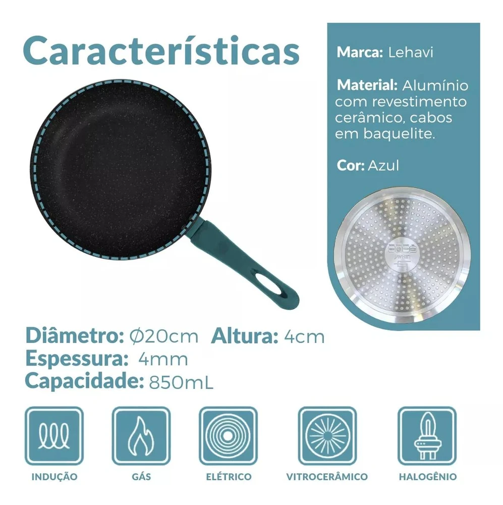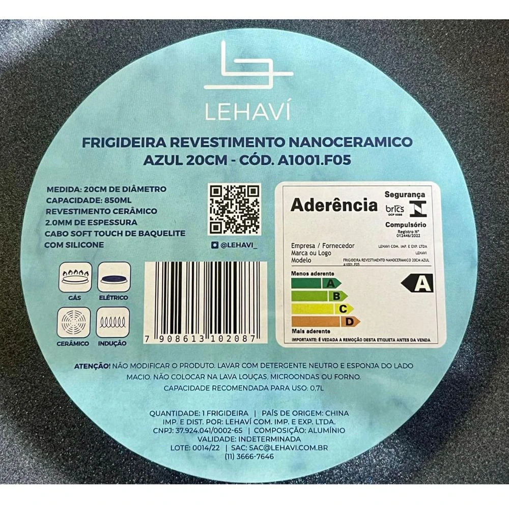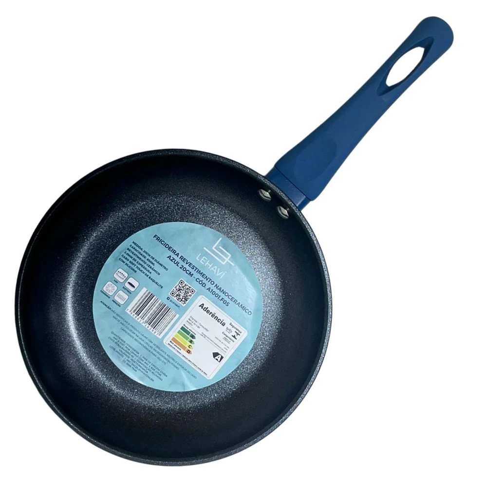 Frigideira Revestimento Nanoceramico 20CM.Cozinhe suas receitas e pratos preferidos com muito mais eficiência e economize tempo na limpeza com a Frigideira Lehavi, fácil de limpar por dentro e por fora!Item essencial em toda cozinha, a frigideira facilita o preparo de deliciosas receitas de forma saudável e saborosa oferecendo resultado mais rápidos e homogêneos, cozinhando o alimento por igual, além de suas cores combinarem com sua cozinha trazendo vivacidade e modernidade.A Lehavi traz a tecnologia exclusiva Limpa Fácil que não permite que suas panelas escorreguem no fogão e proporciona economia de tempo, facilitando o trabalho na hora da limpeza, diferente das bases comuns do mercado que mancham e são difíceis de limpar.Além disso, elas são compátiveis com fogões a gás, eletricos, cerâmicos e por indução.Para que tenha o perfeito funcionamento, antes do uso, é necessário realizar a cura da frigideira corretamente, caso contrário, não terá antiaderência. Características:- Tipo de Material: Aluminio- Espessura (em mm): 2,0mm- Revestimento Interno: Revestimento Nanocaramico- Base: Limpa Fácil- Fogos: Gás, Eletrico, Cerâmico e Indução- Material do Cabo/Asa: Baquelite com Silicone- Comprimento Cabo/Asa (em cm): 14cm- Lava-Louças?: Não- Microondas?: Não- Forno convencional?: Não- Freezer?: Não- Diâmetro (em cm): 20 cm- Volume Total: 0,7L