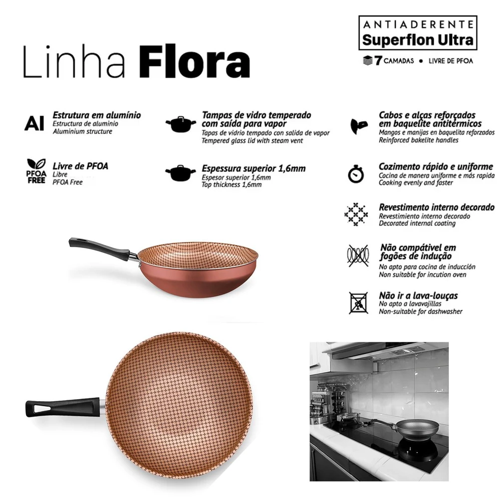 A linha Flora apresenta um design moderno e elegante. A frigideira é compatível com lava-louças, o que facilita a limpeza.