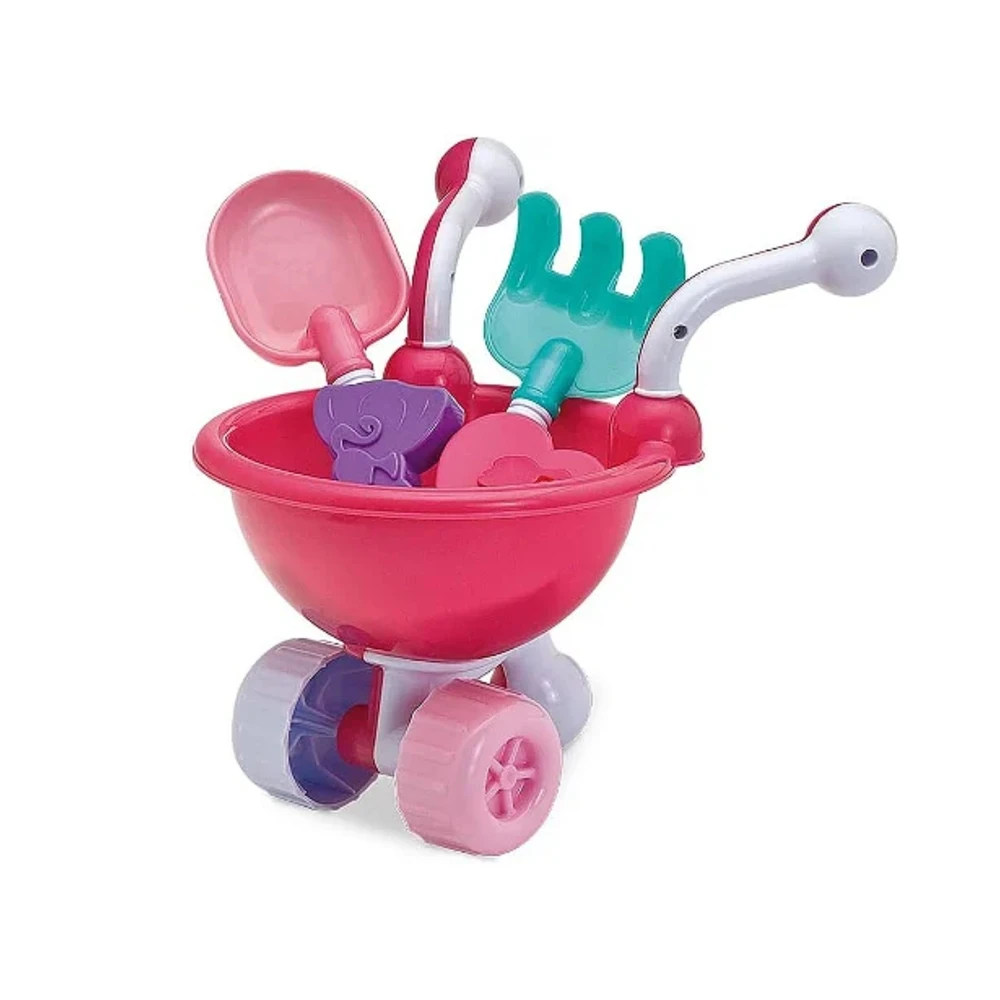 Itens inclusos: 1 carrinho, 1 rastelo, 1 pá, 2 forminhas de areia, 1 sacola para guardar, 1 cartela de adesivos de brinde