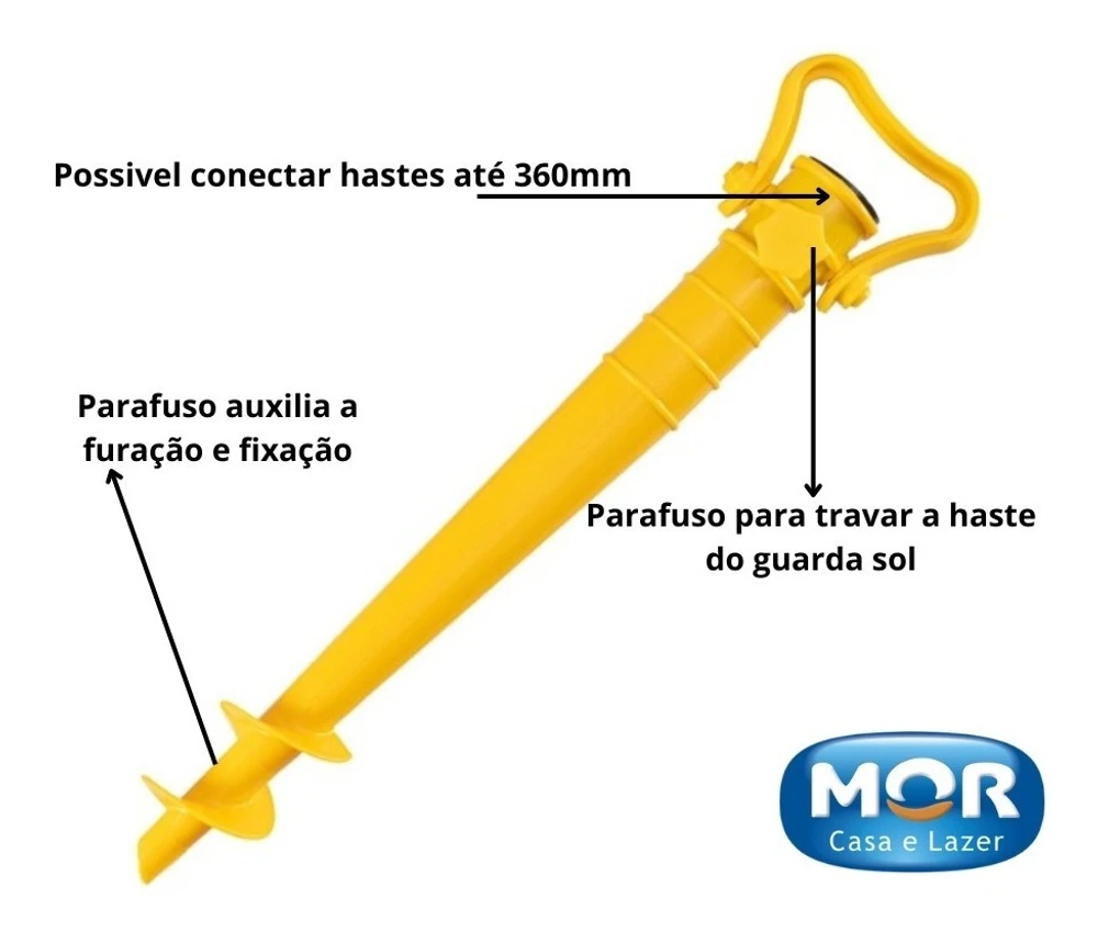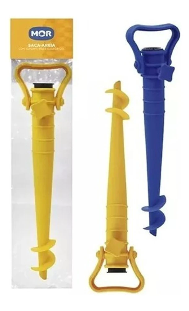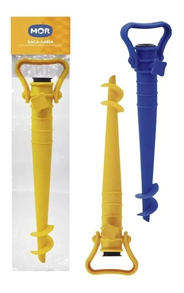O saca Areia que fura a areia no local desejado, e que serve de suporte para você colocar seu guarda sol e curtir o dia de praia e diversão!Ótimo para você que também possui uma barraca na praia e aluga mesas e guarda sol!!Características Técnicas:- Material: Polipropileno;- Cor: Azul ou Amarelo;- Resistente;- Marca: Mor;- Dimensões fechado: 42cm x 4,5cm (comp. larg.)- Furo com regulagem.Corre que o verão esta chegando!É possível conectar hastes de até Ø36mm.Itens Inclusos:01 Saca-areia e suporte para guarda sol Mor.Ideal para você furar a areia e usar de suporte para fixar seu guarda sol!!