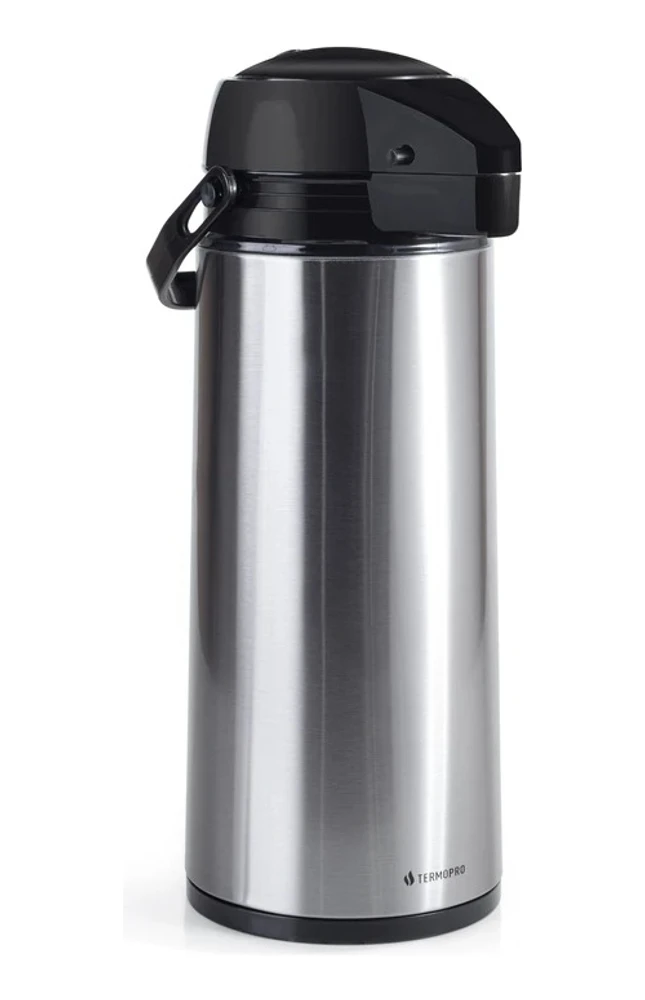 TP6544Garrafa Térmica Aço Inox Basic Airpot 1,9 L Termopro GlassO dia só começa depois de um bom café, não é mesmo? E a Garrafa Térmica Aço Inox Basic Airpot Termopro Glass atende sua necessidade, em casa ou na empresa, pois é produzida em aço inoxidável escovado de alta qualidade com ampola de vidro! Possui isolante térmico que mantém as bebidas quentes por até 9h e frias por até 20h. Muito resistente e bem fácil de limpar, com design moderno, botão para acionamento que potencializa a pressão e facilita a saída do líquido e alça retrátil para transporte com praticidade.Saiba qual a litragem mais indicada para a sua necessidade:350 ml - 2 pessoas600 ml - 4 pessoas1 L - 8 pessoas1,6 L - 12 pessoas2 L - 16 pessoasEssa indicação é válida para consumo normal. Para melhor desempenho da sua garrafa, utilize sempre a capacidade total. O número de aberturas da garrafa pode interferir na concentração da temperatura em seu interior, ocasionando troca de calor com o meio externo. É recomendado escaldá-la antes de cada uso.Informações TécnicasRef.: TP6544Material: Aço Inoxidável + PolipropilenoCapacidade: 1,9 LAmpola: vidroPeso (KG): 0,955CxLxA: 14 x 17 x 39 cmMarca: TermoproFabricante: Marcamix - Utilidades GourmetRecomendaçõesUso e ConservaçãoQuando for usar, retire a tampa e lave a parte interna com água morna. Durante a preparação de bebidas quentes, escalde a garrafa com água fervente, espere alguns minutos e descarte a água. No caso de bebidas frias, escalde a garrafa com água gelada.Coloque o líquido a ser mantido quente ou frio na garrafa, deixando 2 cm abaixo da tampa para conservação da temperatura por mais tempo. No caso do café, indica-se que a filtragem seja feita diretamente sobre a garrafa. Para o chá, o ideal é derramar a água quente na garrafa e usar somente o sache e não folhas de chá.LimpezaA garrafa deve ser lavada toda vez que for usada, logo depois que voltar para a temperatura ambiente. Lave com detergente e enxágue com água abundante. Para obter um melhor resultado, utilize bicarbonato de sódio com água morna e caso reste algum resíduo, repita o processo.Não lavar em máquina de lava-louça, não utilizar palha de aço ou outros produtos agressivos, pois poderão danificar o produto. Para secar, utilize um pano seco macio e deixe o produto sem tampa quando não estiver em uso.Cuidados1. O produto foi projetado para manter a temperatura por mais tempo de bebidas quentes ou frias, por isso não o use para outros fins.2. Não agite a garrafa e mantenha-a sempre na posição vertical.3. Transporte a garrafa somente pela alça e evite quedas e impactos, pois pode ocorrer vazamento de ar e insuficiência em suas funções.4. Não introduza a garrafa em forno a gás, micro-ondas ou elétrico, freezer e máquina de lava-louças.5. Não utilize aquecedores e nem a exponha ao fogo.6. Não utilize a garrafa para água gaseificada.7. Após o uso para bebidas lácteas, sopas ou outros produtos orgânicos, lave-a com água fervente para remoção total de possíveis resíduos.8. Mantenha a garrafa fora do alcance de crianças.VantagensProduzida em aço inoxidável escovado de alta qualidade e ampola de vidro! Isolante térmico de até 9h quente e 20h frio. Resistente e fácil de limpar. Design moderno e inovador, com botão para acionamento que potencializa a pressão e facilita a saída do líquido e alça retrátil para transporte com praticidade e segurança.