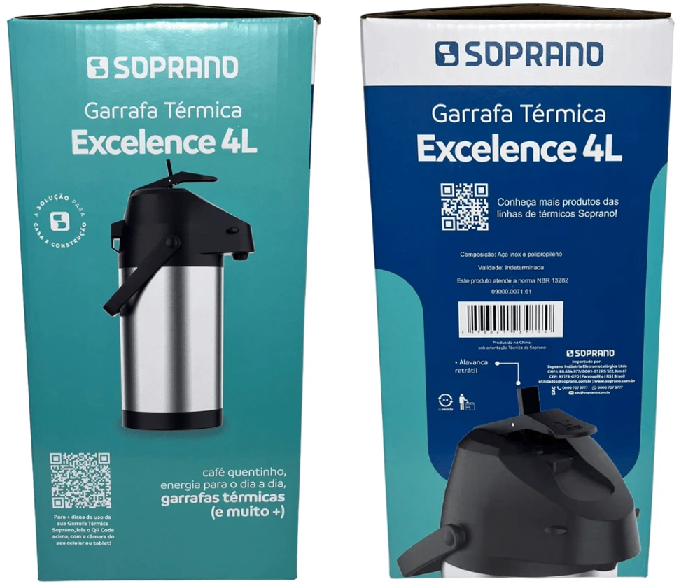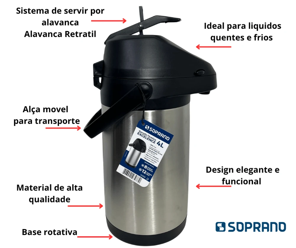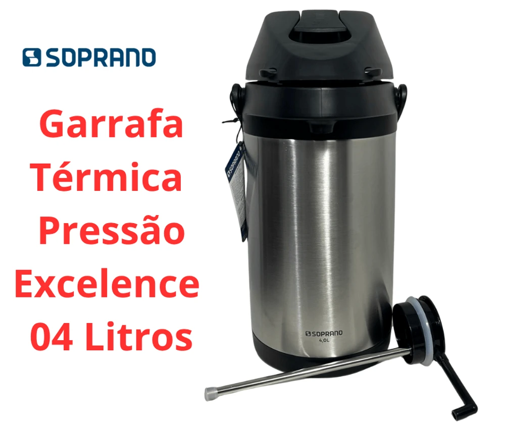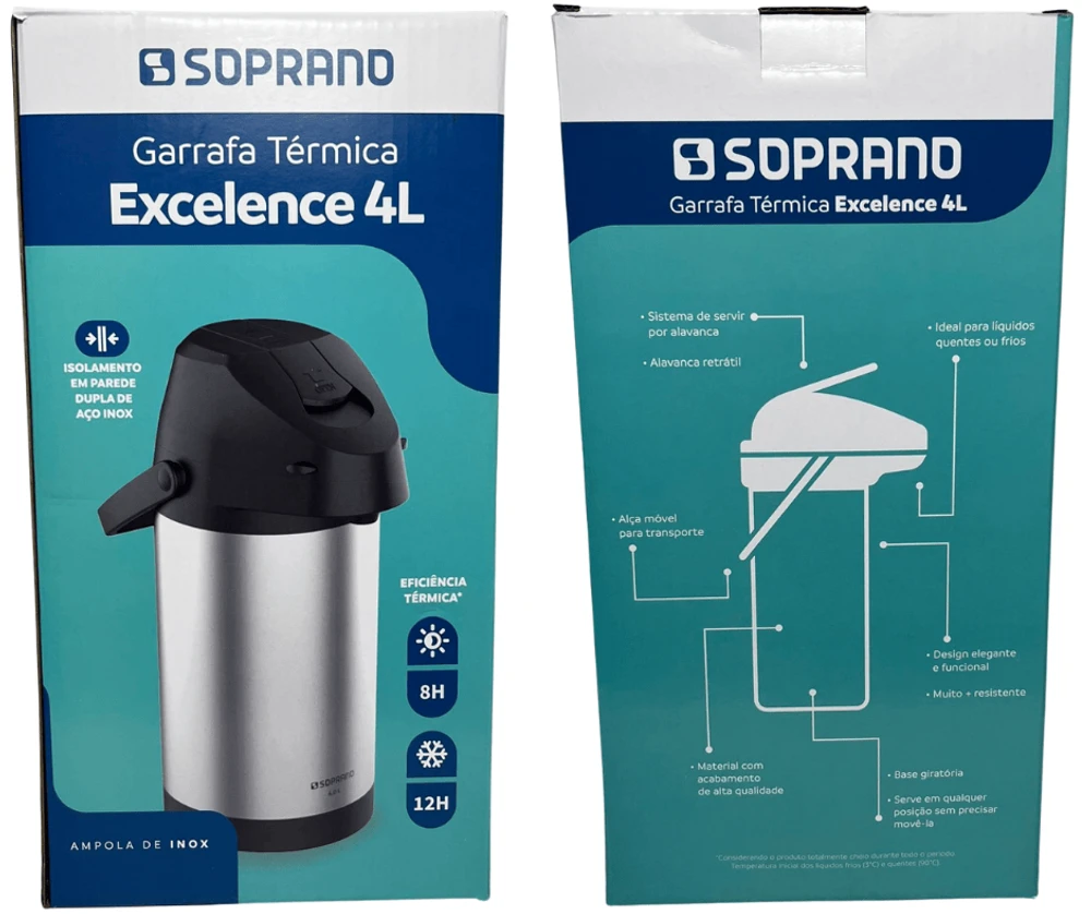Desenvolvida para atender grandes demandas , a Garrafa Térmica Excelence 4L - Soprano oferece alta capacidade e excelente conservação térmica, tornando-se a escolha ideal para ambientes que exigem praticidade e desempenho superior.