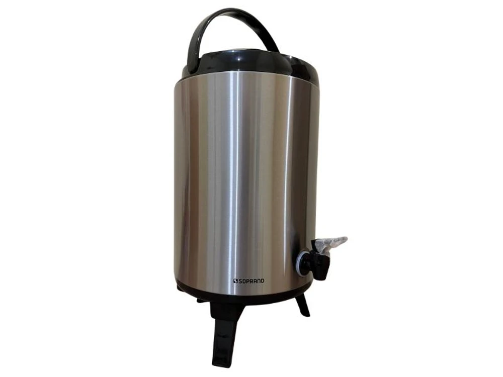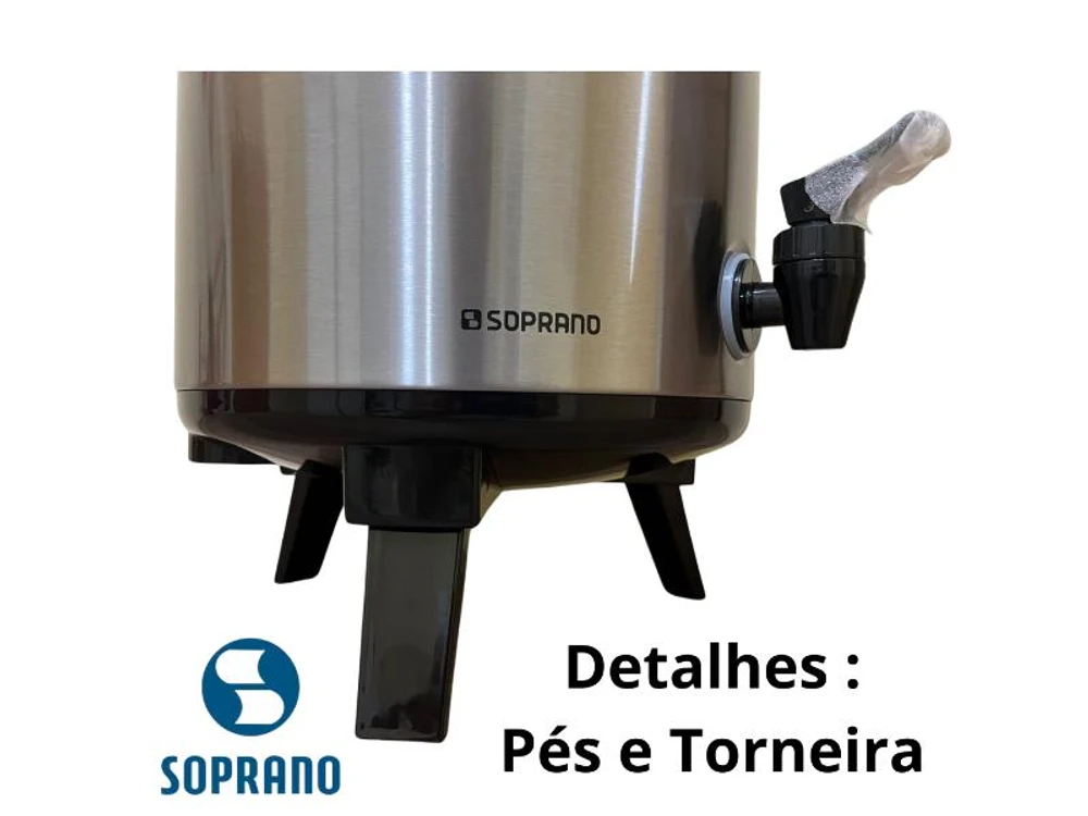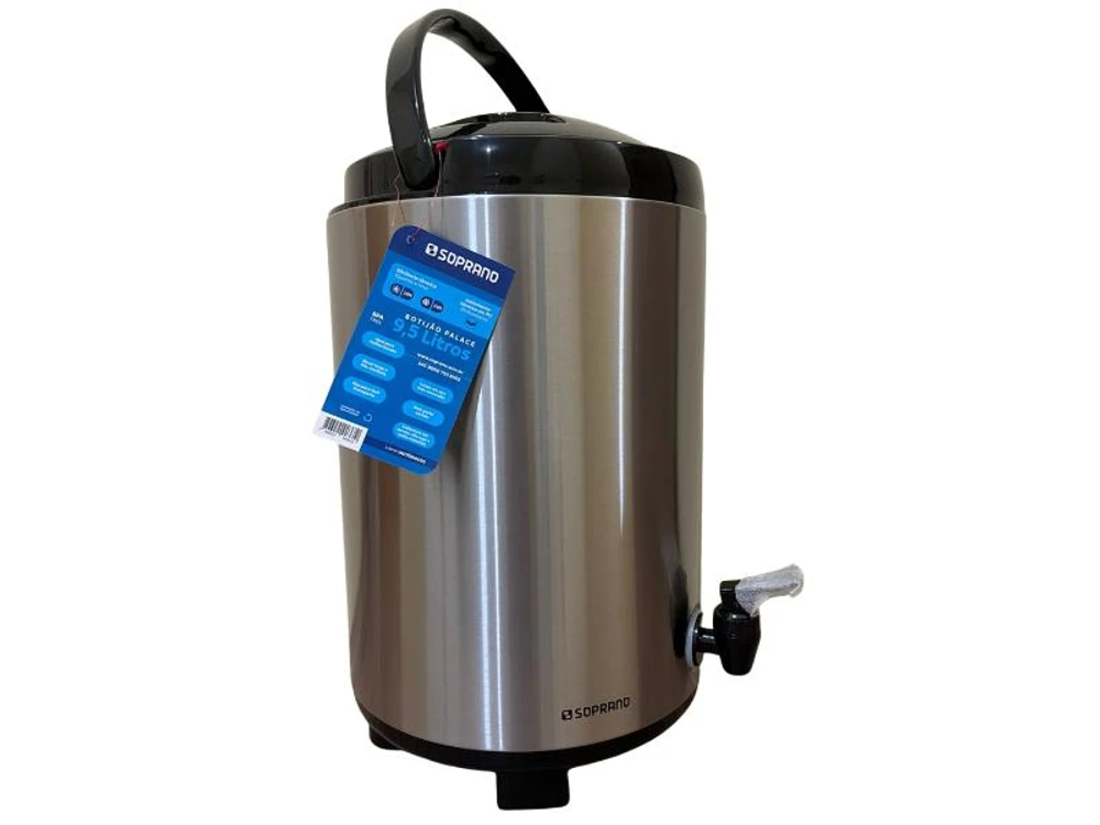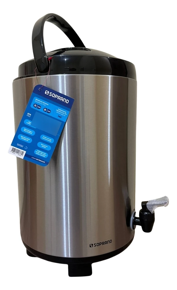 Botijão térmico 9,5 litros de inox com alça para transporte, pés retráteis, porta sache de açúcar e bocal largo para colocar gelo ou líquidos.