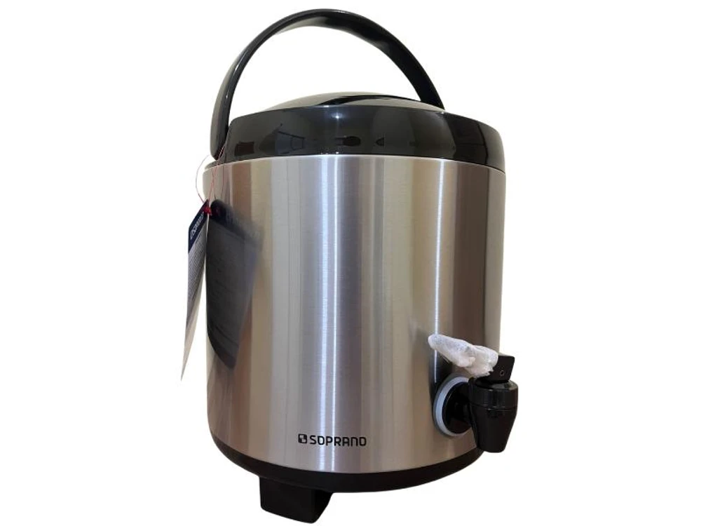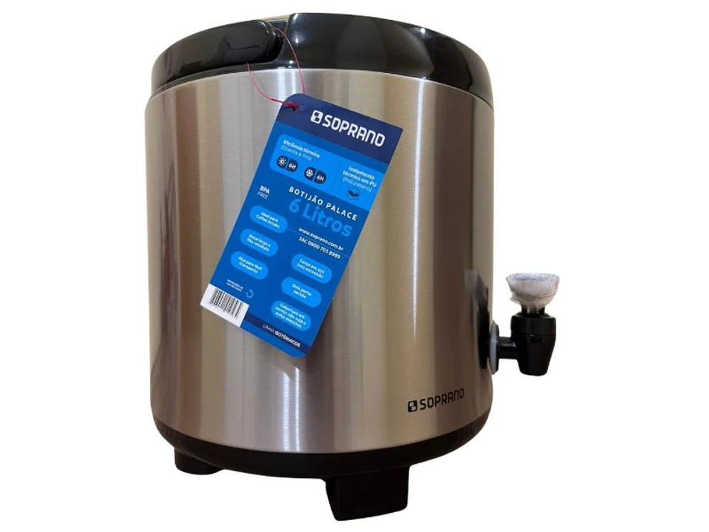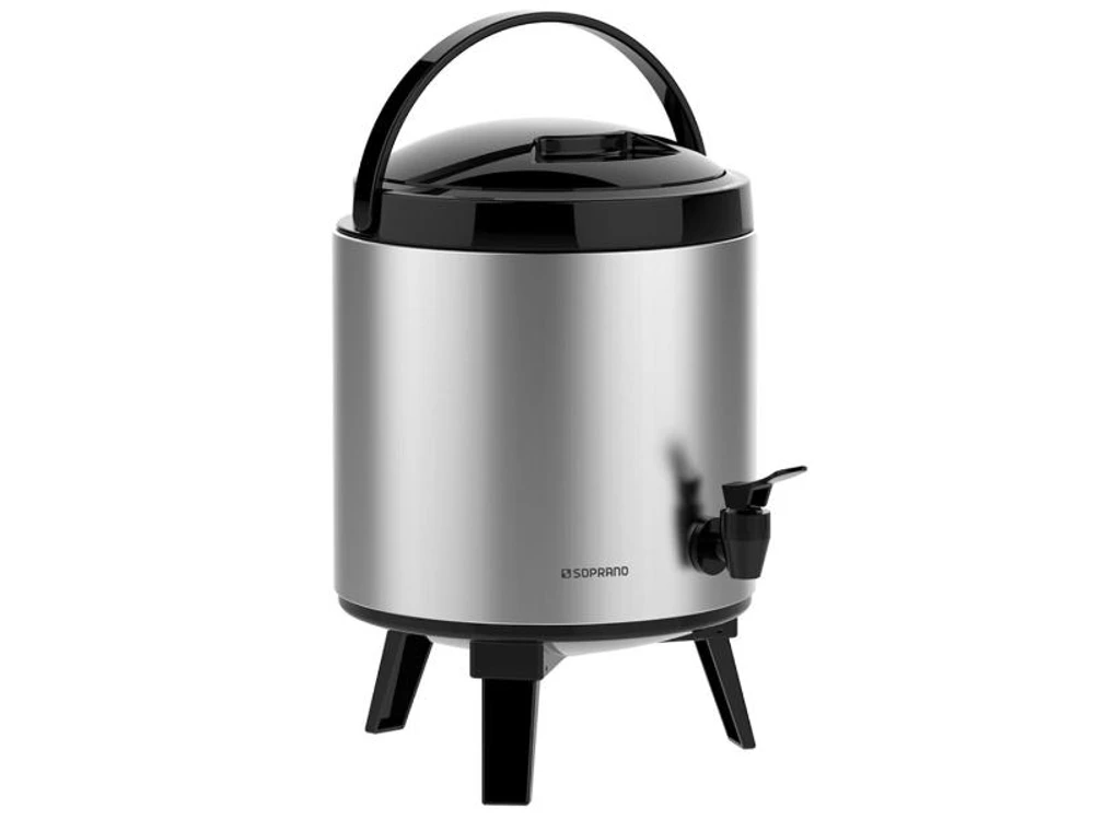Botijão térmico 6 litros de inox com alça para transporte, pés retráteis, porta sache de açúcar e bocal largo para colocar gelo ou líquidos.