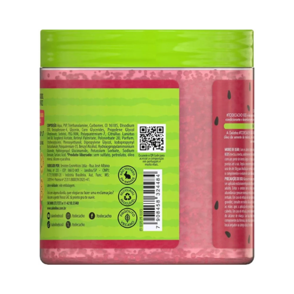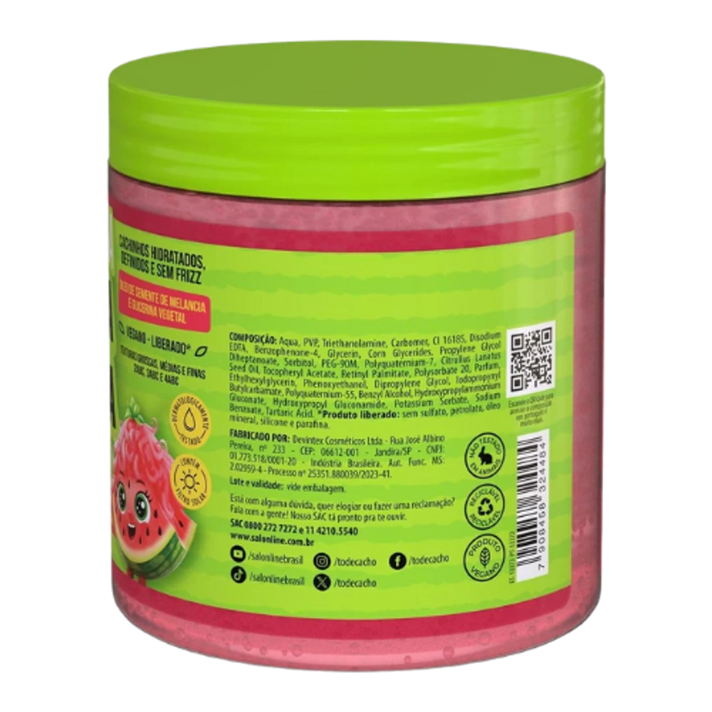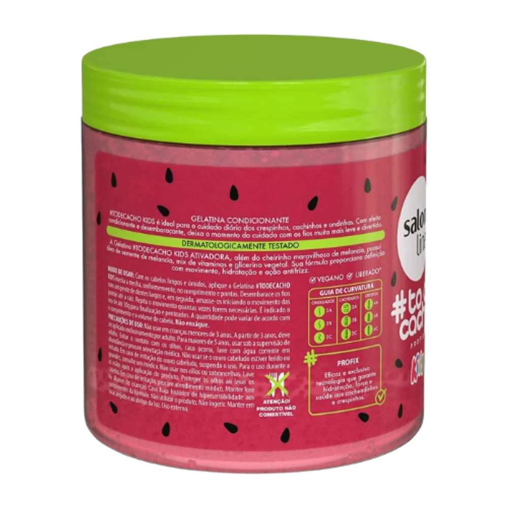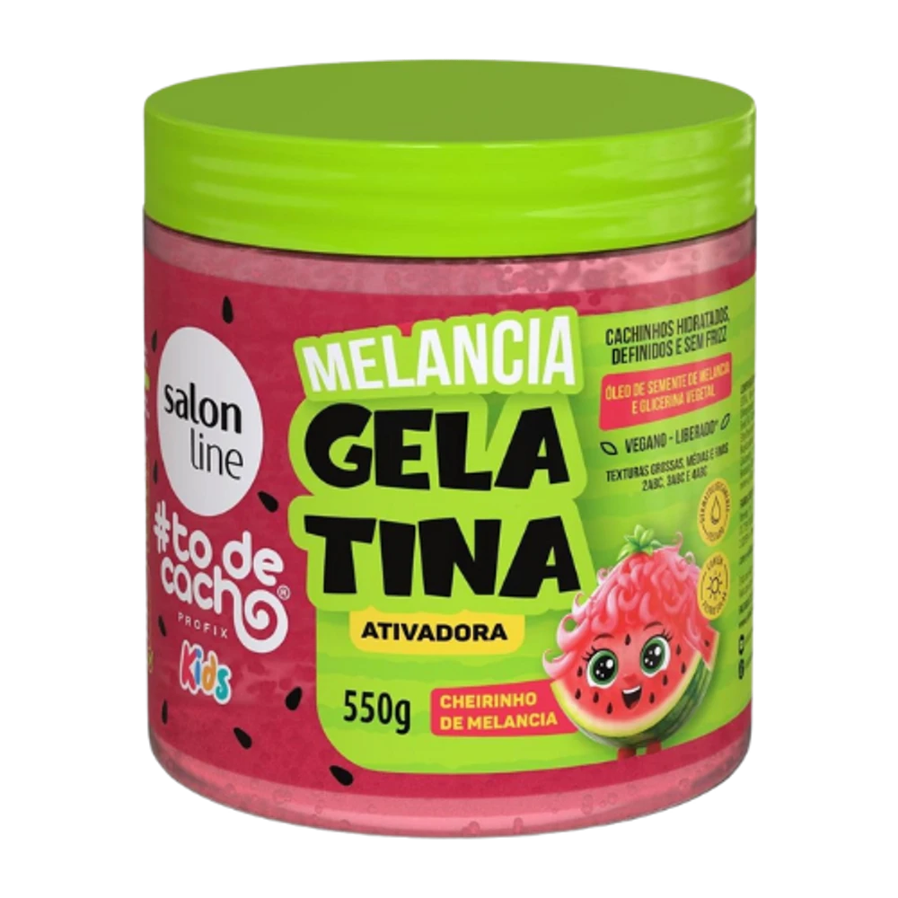 A Gelatina Ativadora de Cachos Salon Line Kids Melancia 550g foi especialmente desenvolvida para crianças com cabelos cacheados e crespos, oferecendo definição leve, fixação controlada e muito brilho, sem ressecar ou pesar os fios. 🍉✨