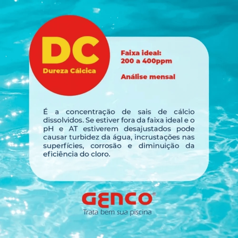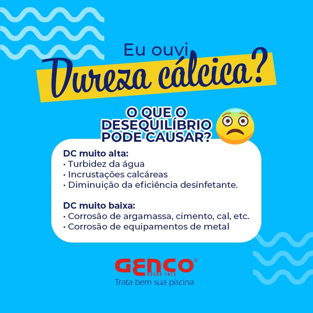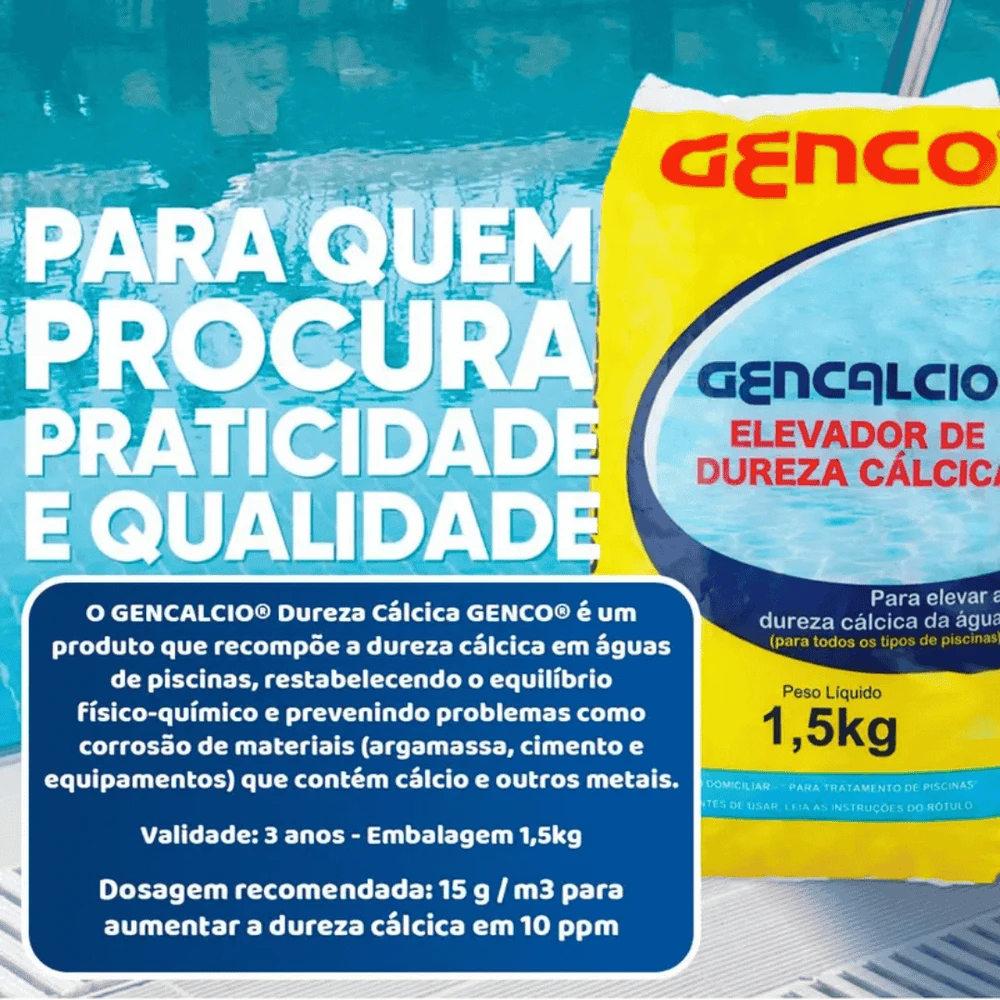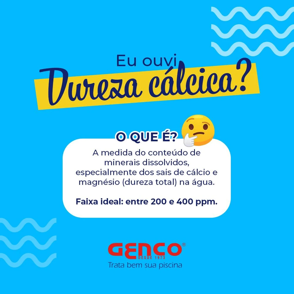 O GENCALCIO® Dureza Cálcica GENCO® é um produto que recompõe a dureza cálcica em águas de piscinas, restabelecendo o equilíbrio físico-químico e prevenindo problemas como corrosão de materiais (argamassa, cimento e equipamentos) que contém cálcio e outros metais.