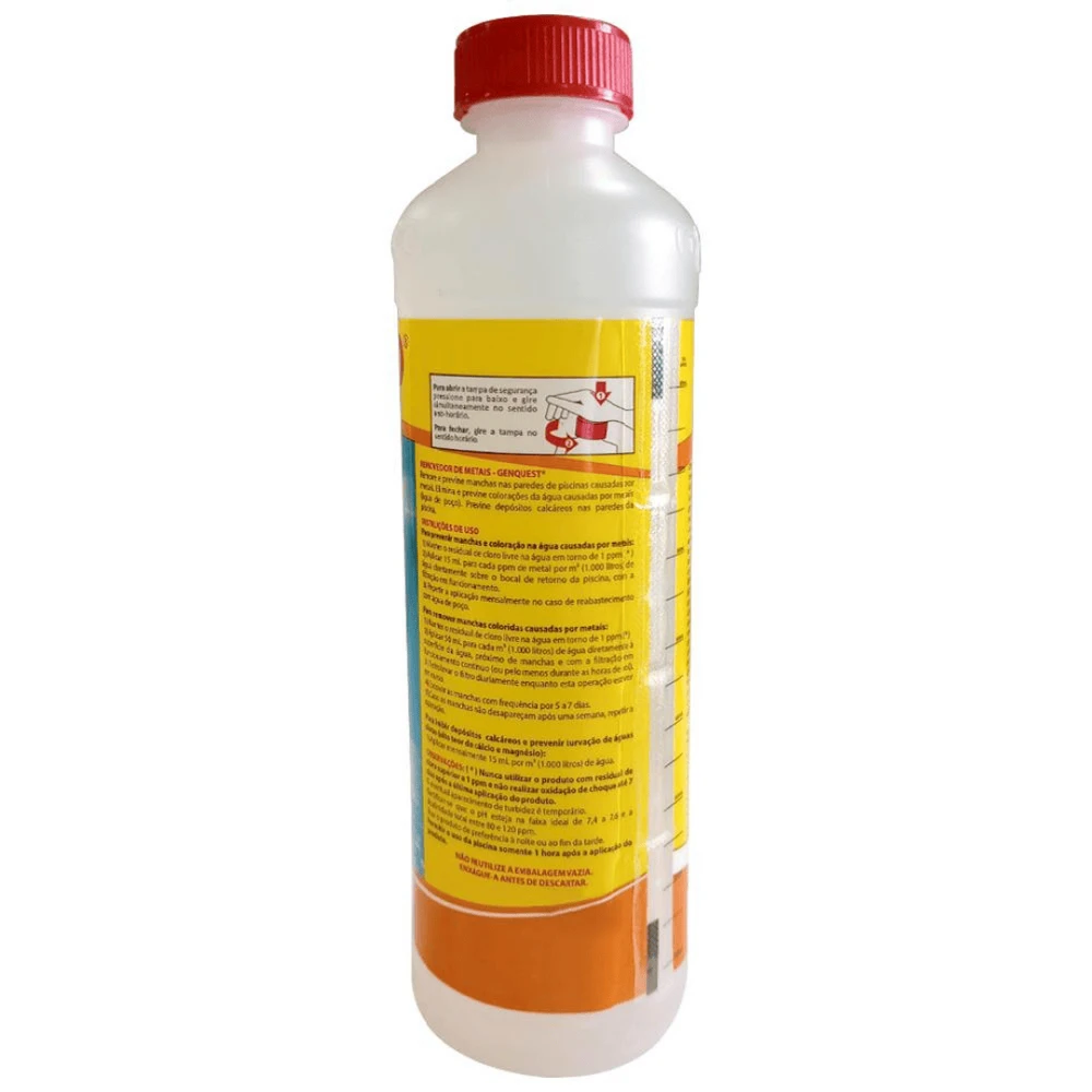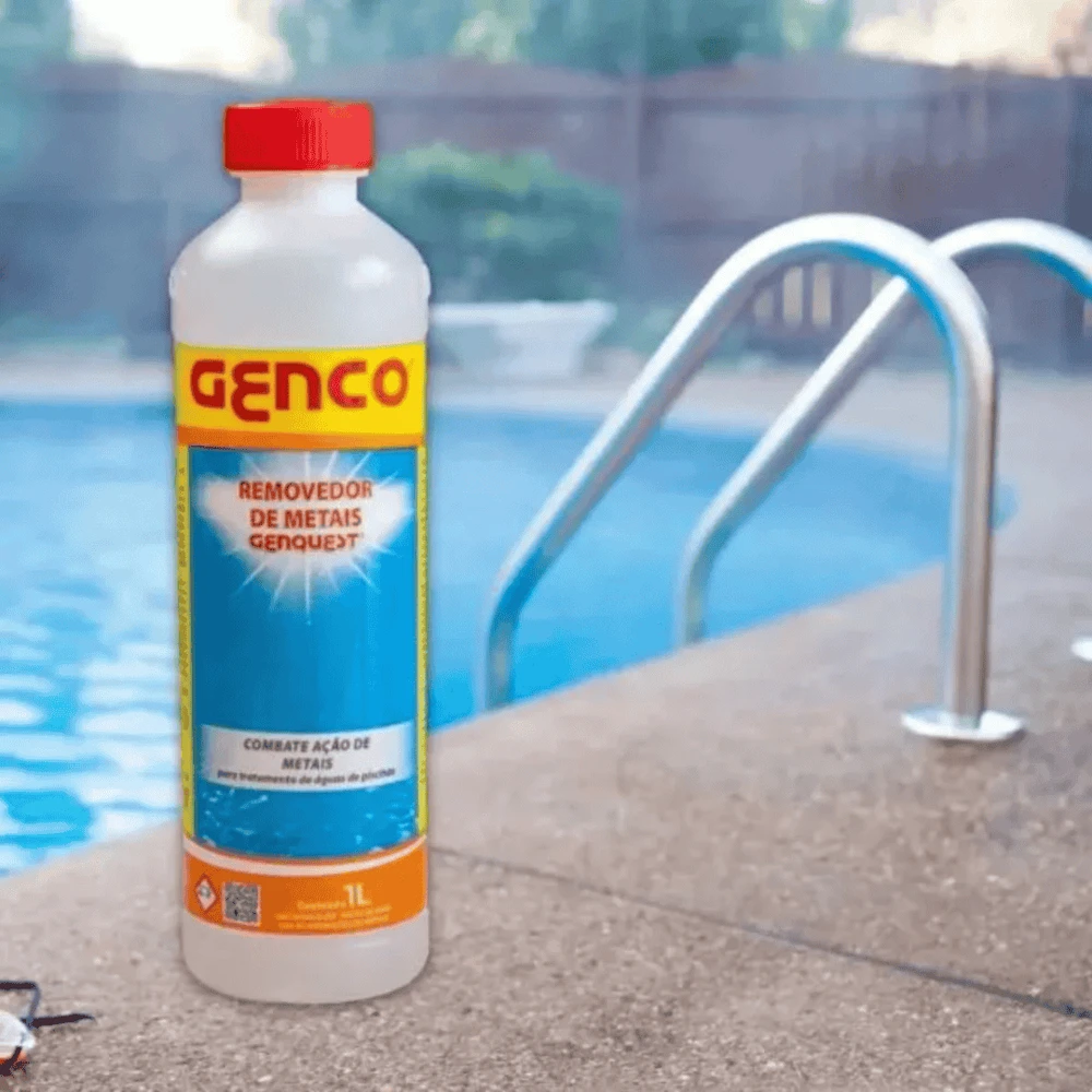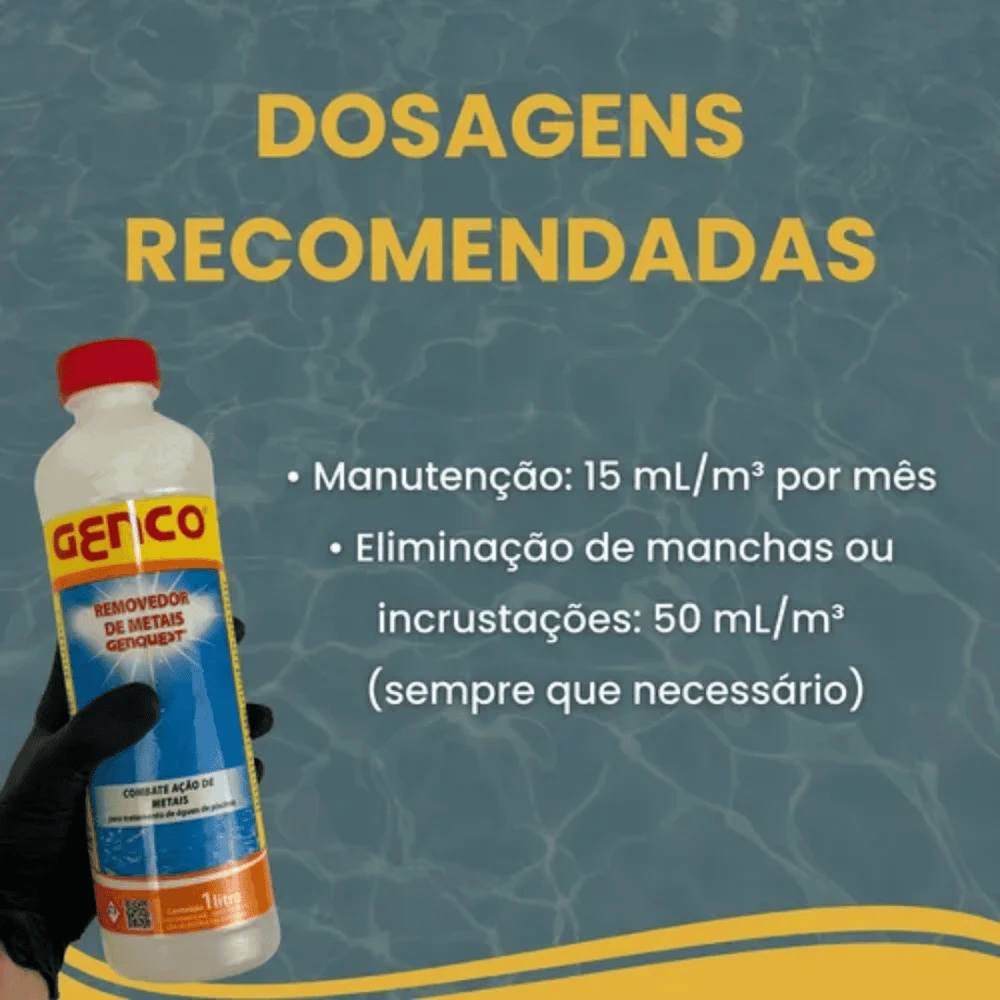 1.1 Para cada ppm de metal (ferro, manganês e cobre) presente na água da piscina use 15 mLde GENQUEST® INIBIDOR DE MANCHAS E INCRUSTAÇÕES GENCO® para cada m³ de água (1000 litros).