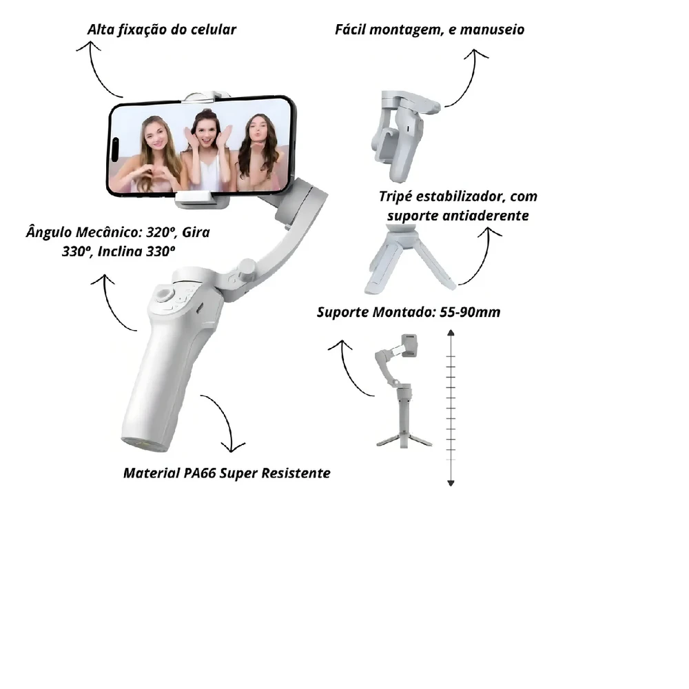 Transforme seus vídeos com o Gimbal Hold On Estabilizador com 3 Eixos Portátil, ideal para quem busca qualidade profissional com praticidade. Compatível com smartphones de 55 a 90mm, oferece alta fixação e estabilidade para capturar imagens suaves, mesmo em movimento. Seu design ergonômico em material PA66 super resistente garante conforto e durabilidade, perfeito para vlogs, eventos e gravações do dia a dia. Com ângulo mecânico de 320°, giro de 330° e inclinação de 330°, permite movimentos fluidos e criativos. O tripé integrado com suporte antiderrapante facilita o uso em diferentes ambientes, elevando a experiência de filmagem. Leve, portátil e fácil de montar, é o equipamento ideal para quem deseja vídeos estáveis e profissionais com o celular. Não perca a chance de destacar seu conteúdo com este estabilizador que já conquistou milhares de usuários satisfeitos.