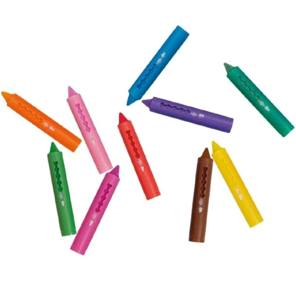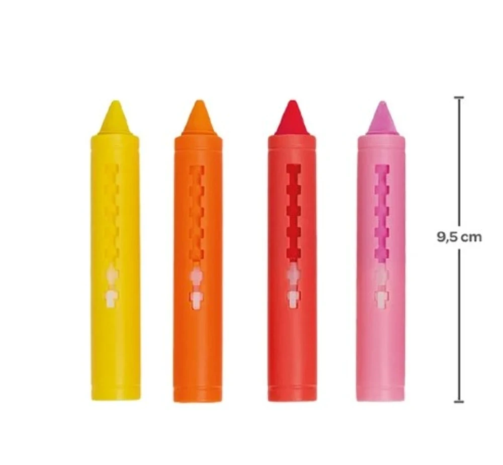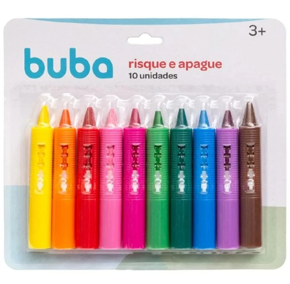 O Risque e Apague da Buba possui 10 gizes de cera coloridos.