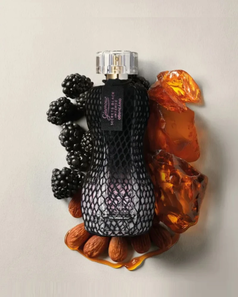 Fragrância feminina elegante, sofisticada e com ingredientes de alta qualidade, Glamour Secrets Black Intense conta com a suculência da Framboesa Negra, o dulçor do Praliné e a elegância do Âmbar.