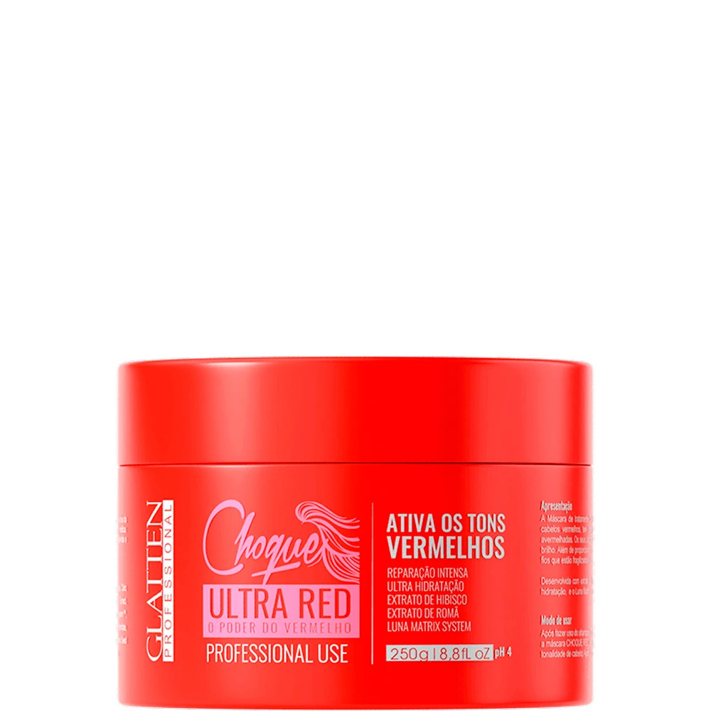 A Máscara de tratamento CHOQUE RED DA GLATTEN foi especialmente desenvolvida para cabelos vermelhos, tem como função nutrir e intensificar a cor de cabelos com tonalidades avermelhadas. Os seus pigmentos vermelhos reavivam a cor desbotada dos cabelos e conferem brilho. Além de proporcionar nutrição intensa e restaurar a elasticidade e sedosidade natural dos fios que estão fragilizados e porosos.