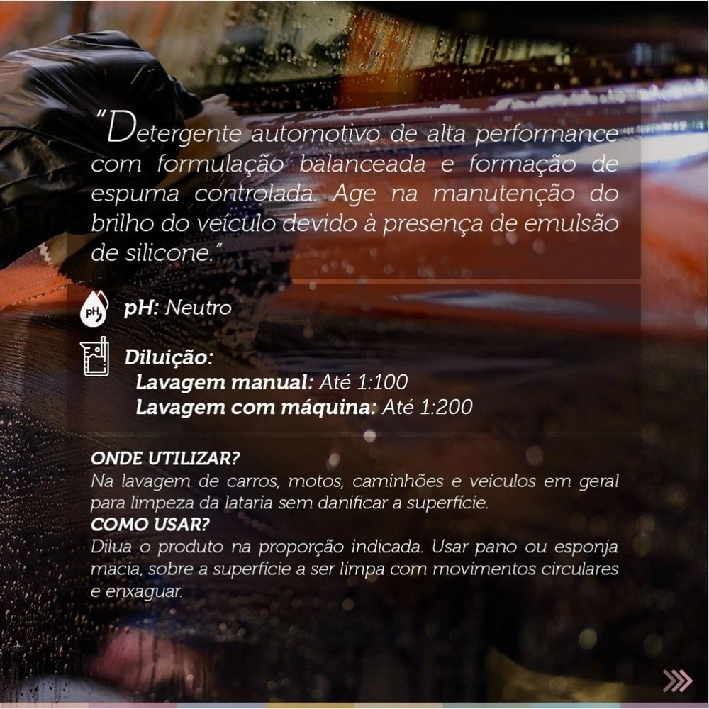 Detergente automotivo de alta performance com formulação balanceada e formação de espuma controlada. Age na manutenção do brilho do veículo devido à presença de emulsão de silicone.