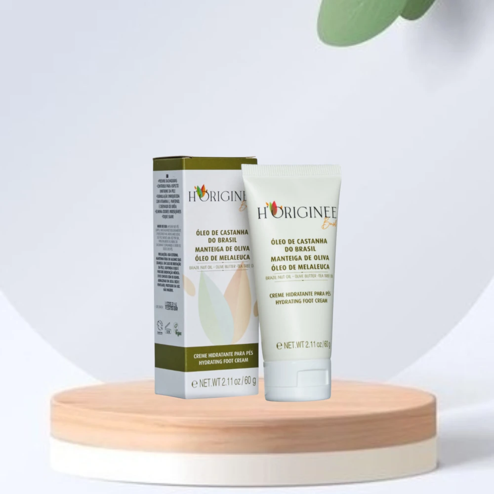 Creme Hidratante para Pés H’Originee vegano e orgânico. Formulado com óleo de castanha do Brasil, manteiga de oliva e óleo de melaleuca. Previne rachaduras, ressecamento intenso e combate odores com ação natural. Possui óleos de andiroba e copaíba para renovação celular. Textura leve de rápida absorção, toque suave e confortável. Hipoalergênico, 0% silicone/corantes/conservantes/petrolatos, 98% ingredientes naturais. Aplicar nos pés limpos, massageando delicadamente. Cuidados eficazes e sustentáveis para pés macios e revitalizados.