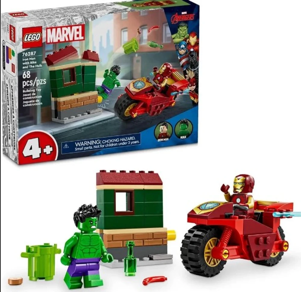 O conjunto de jogos lega Marvel inclui minifiguras do homem de ferro e do incrível hulk, além da motocicleta de brinquedo montável e de empurrar do homem de ferro e uma casa montável.