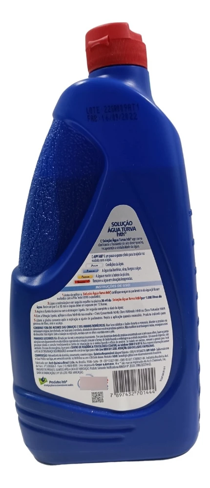Modo de Usar: Antes de aplicar o hth® Solução Água Turva, certifique que o parâmetros da água já foram avaliados. Ligue a recirculação e em seguida espalhe na piscina 20 ml do hth® Solução Água Turva por 1.000 litros de água. Recircule por 5 a 10 minutos e depois deixe em repouso por 12 horas; Aspire o fundo da piscina com a drenagem ligada. Em seguida complete o nível da água.