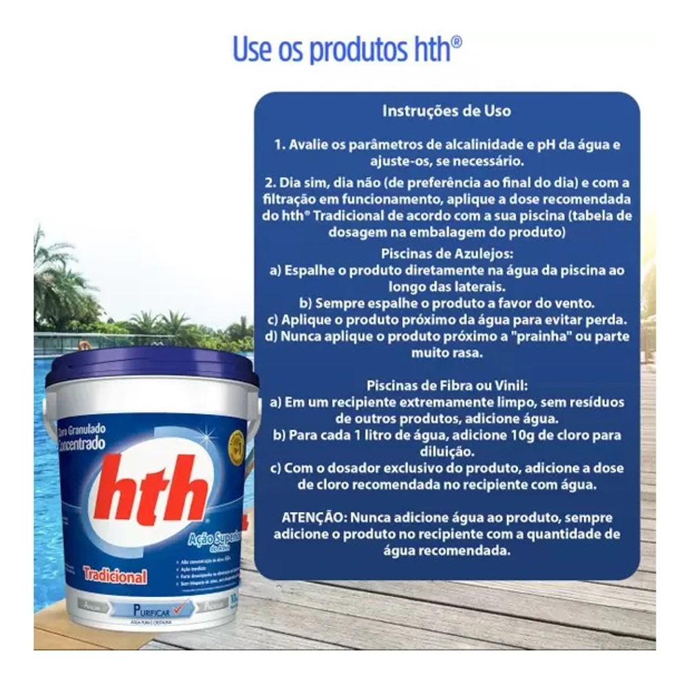 *aproximadamente 4g hth® Cloro Aditivado 10 em 1 para cada 1.000 litros (1m³) de água.